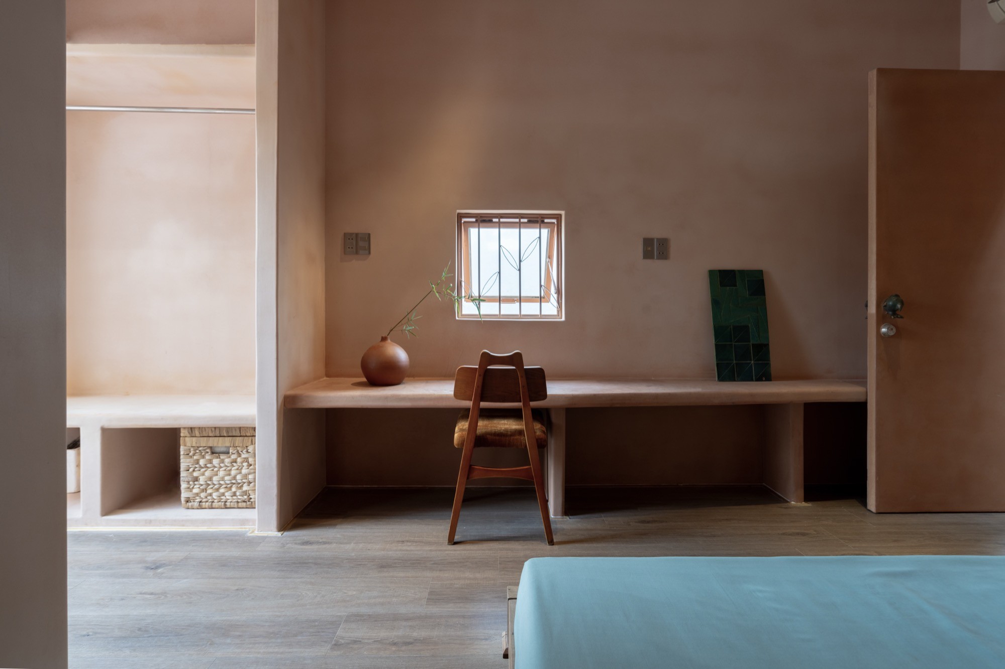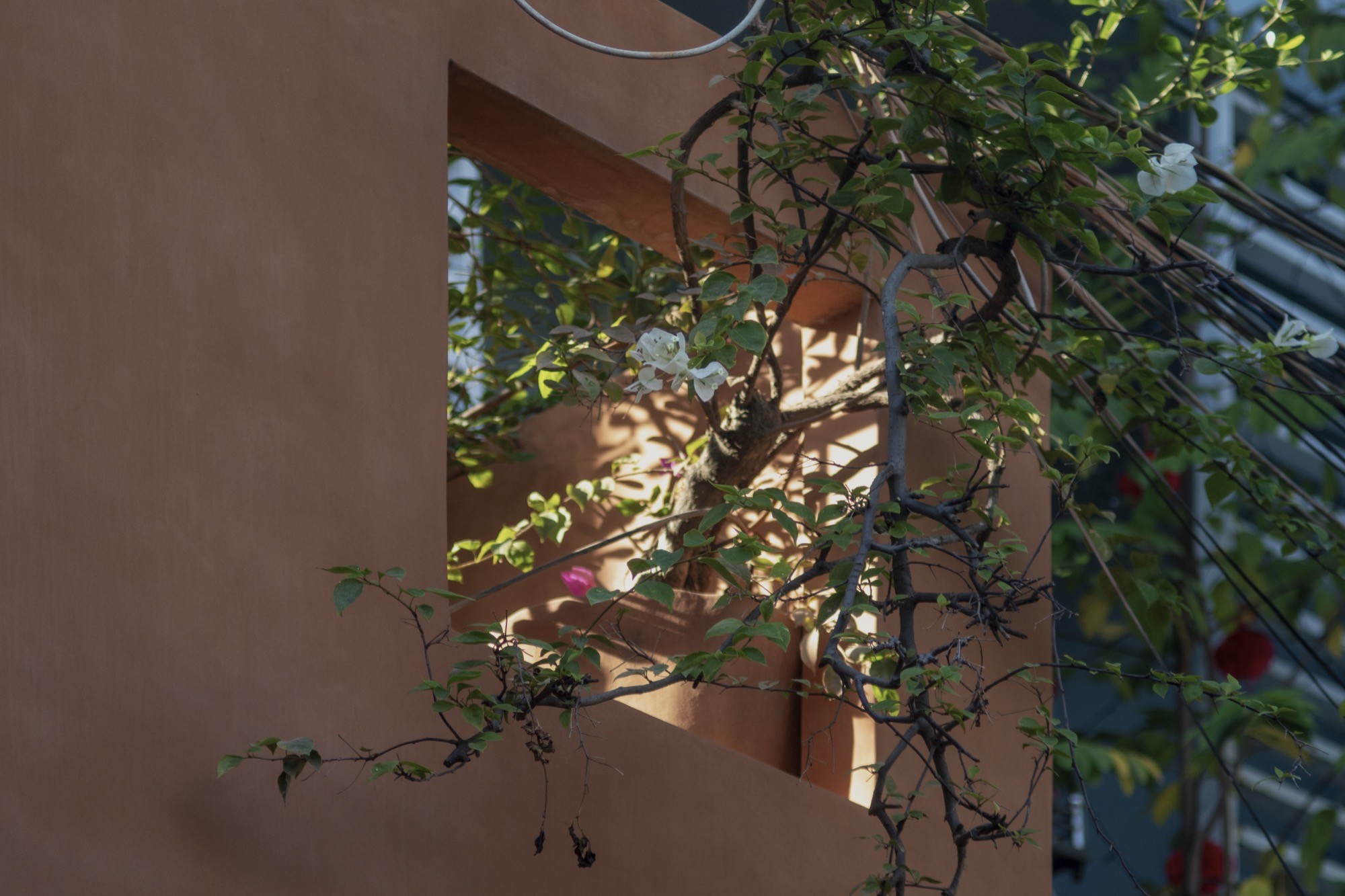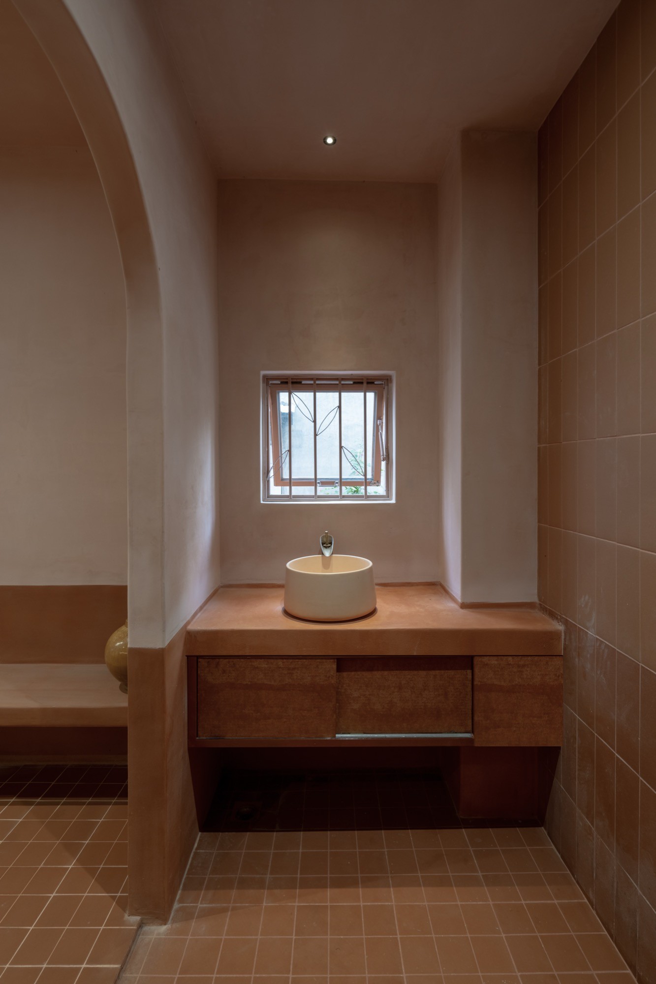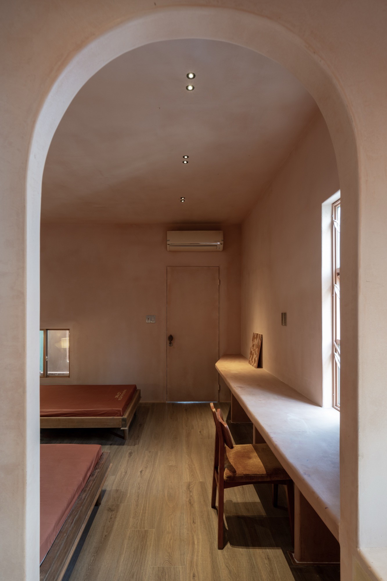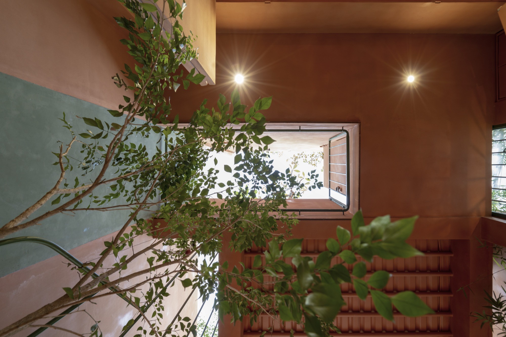 Bảng vật liệu thiên về sắc độ đất với gạch gốm, gỗ tái chế, sắt thô và hỗn hợp đất sét cải tiến để thích ứng khí hậu. Nội thất phần lớn do chính gia chủ chế tác, từ những chi tiết gợi hình ảnh đời sống nông thôn đến các cấu kiện tái sử dụng