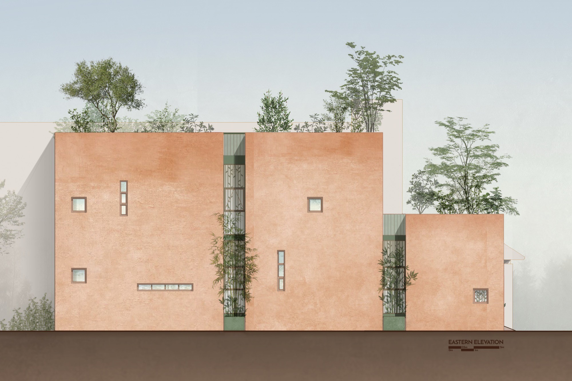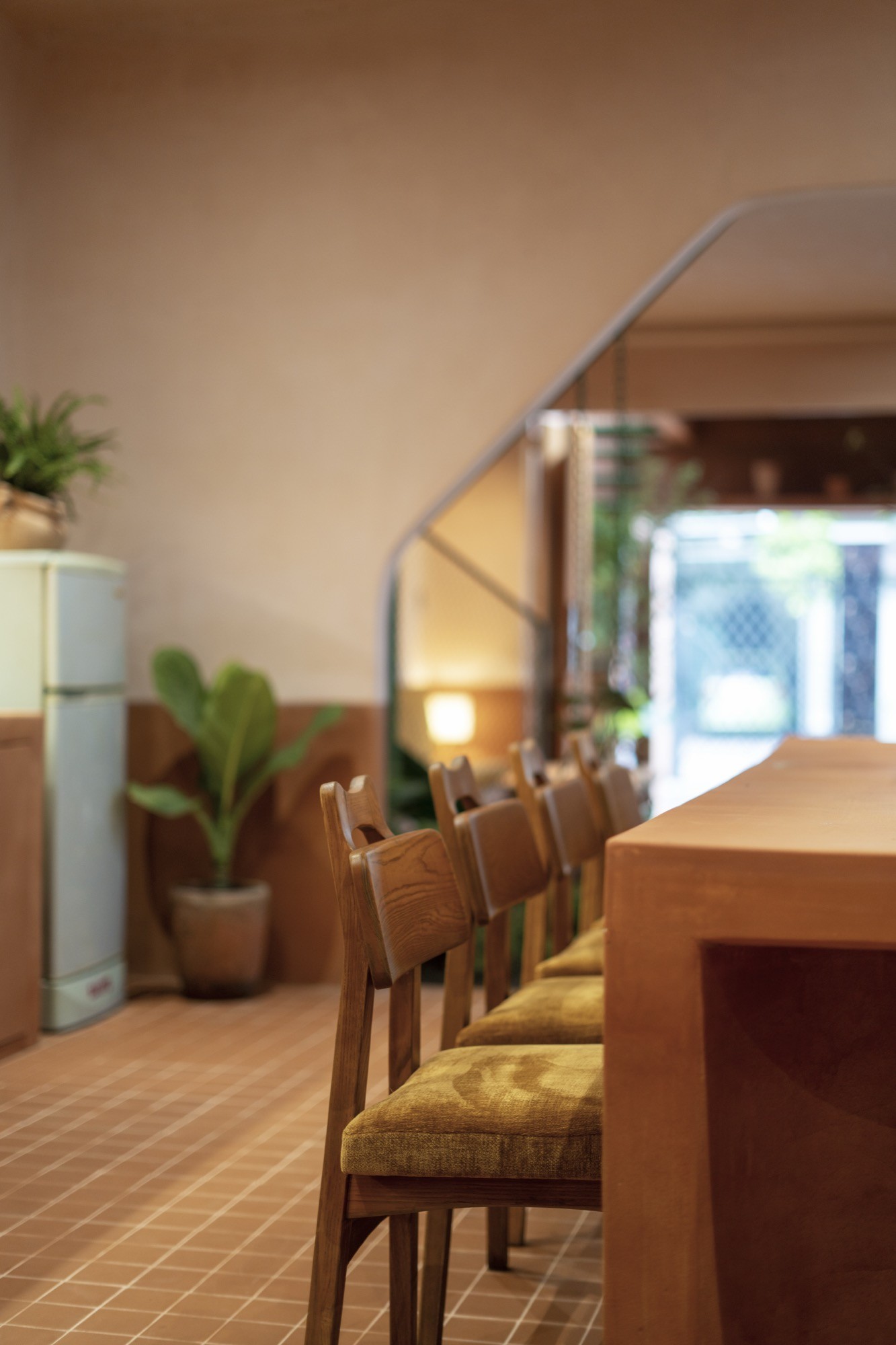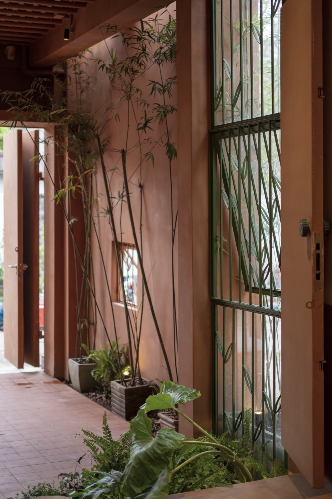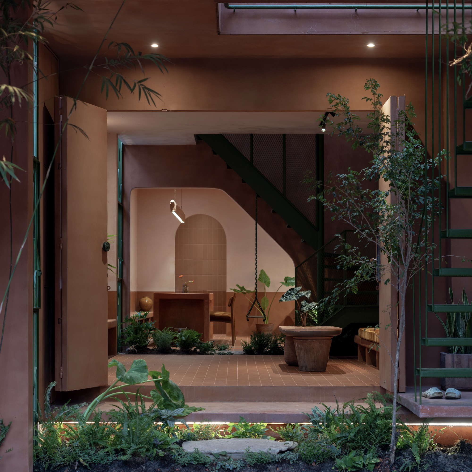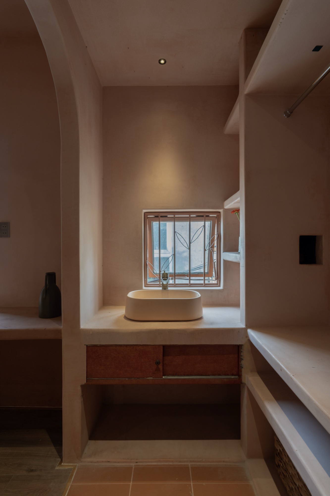 Bảng vật liệu thiên về sắc độ đất với gạch gốm, gỗ tái chế, sắt thô và hỗn hợp đất sét cải tiến để thích ứng khí hậu. Nội thất phần lớn do chính gia chủ chế tác, từ những chi tiết gợi hình ảnh đời sống nông thôn đến các cấu kiện tái sử dụng
