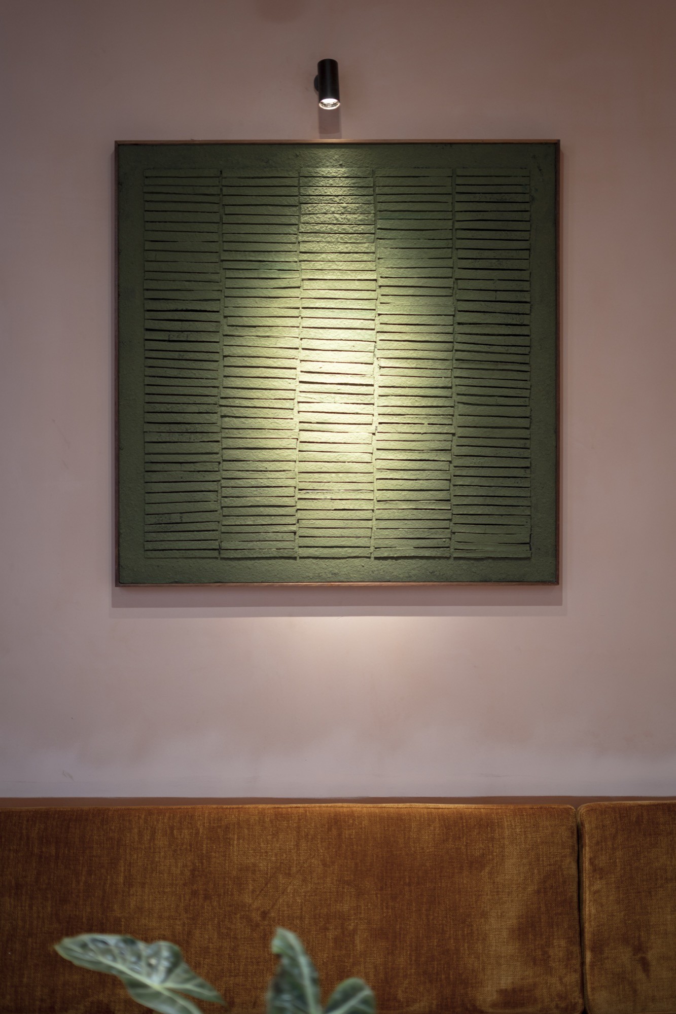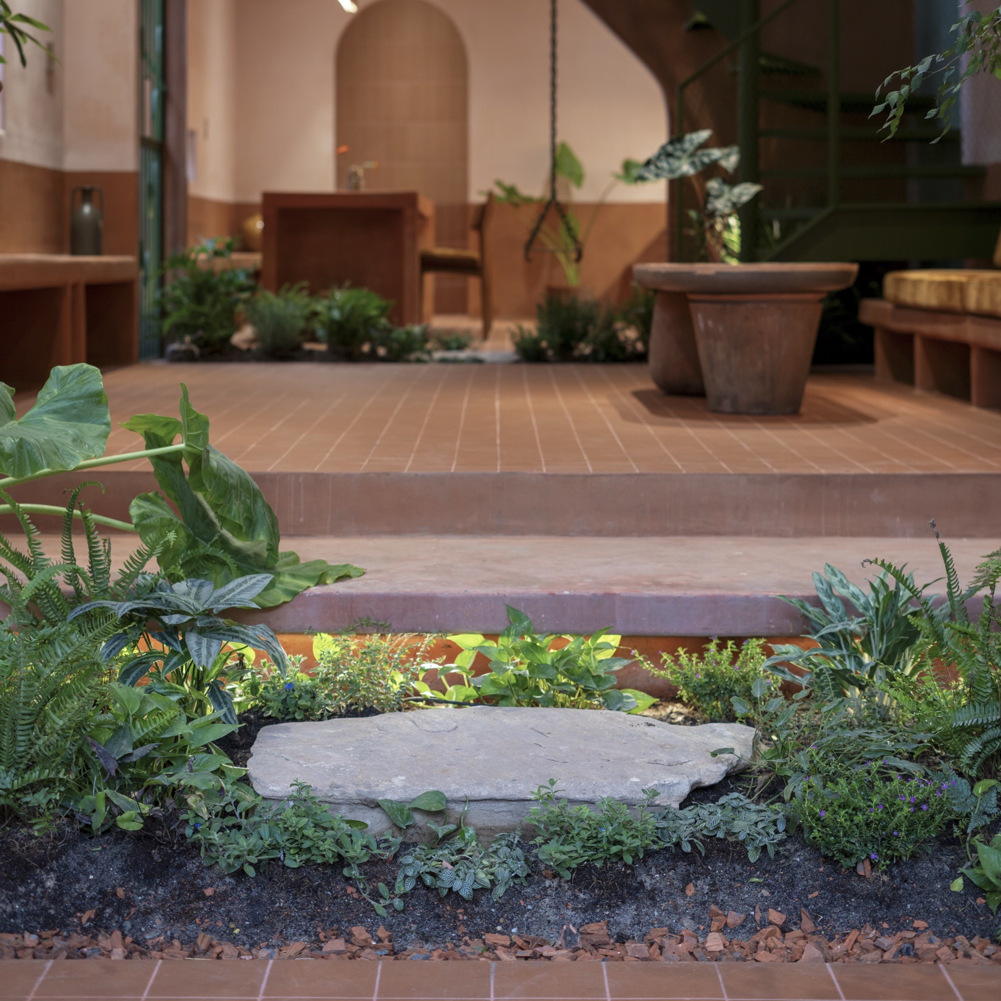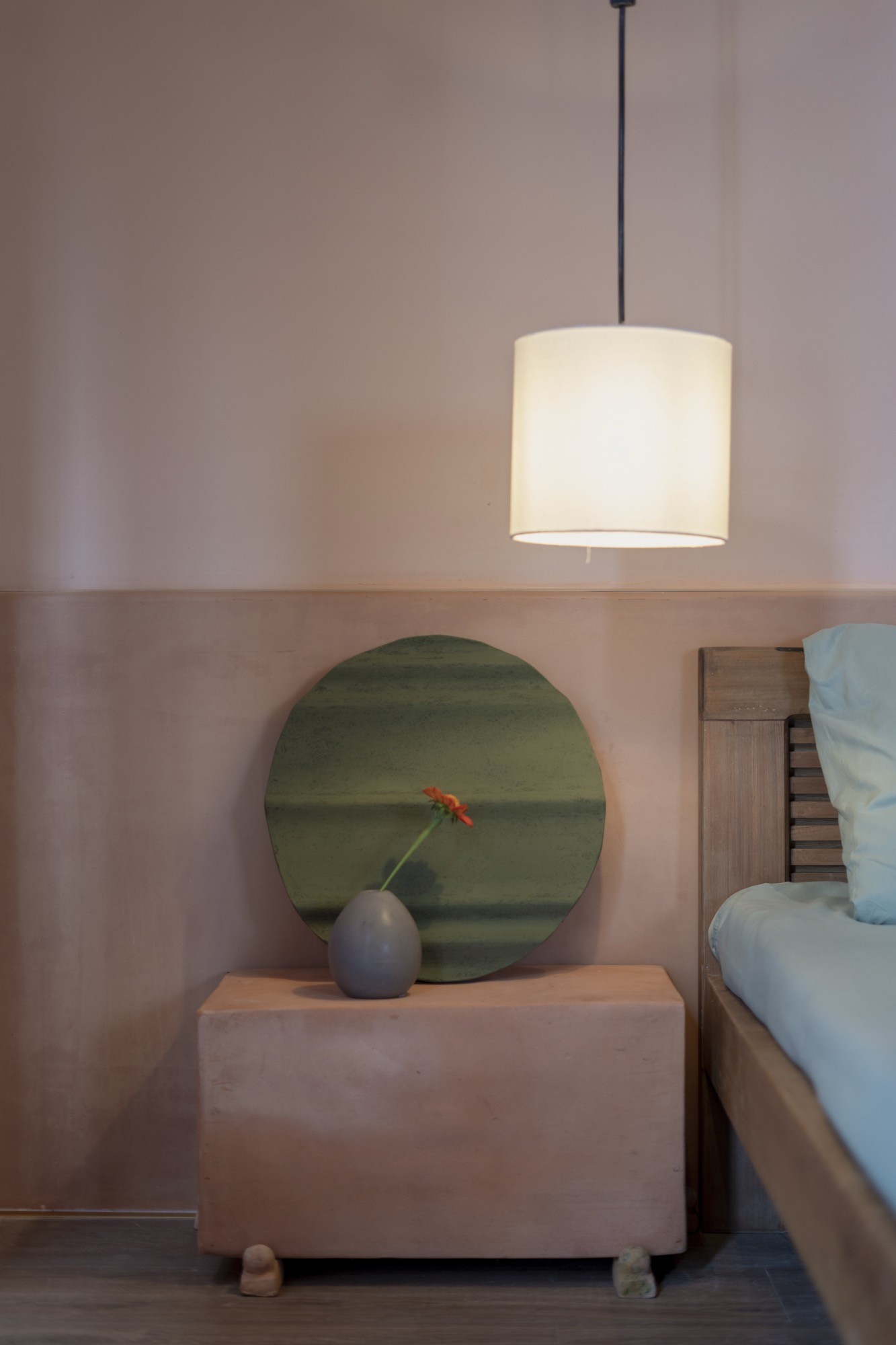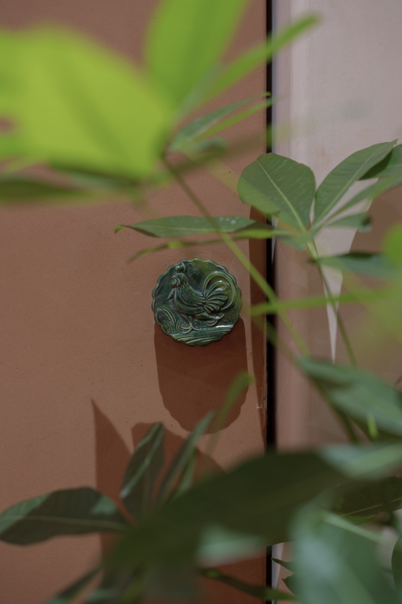 Bảng vật liệu thiên về sắc độ đất với gạch gốm, gỗ tái chế, sắt thô và hỗn hợp đất sét cải tiến để thích ứng khí hậu. Nội thất phần lớn do chính gia chủ chế tác, từ những chi tiết gợi hình ảnh đời sống nông thôn đến các cấu kiện tái sử dụng
