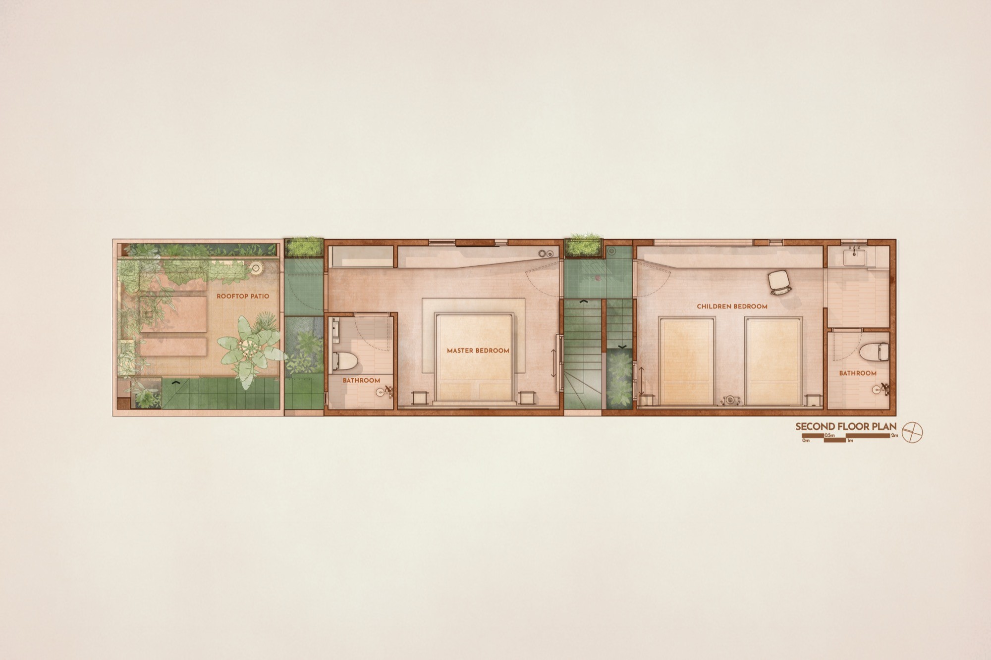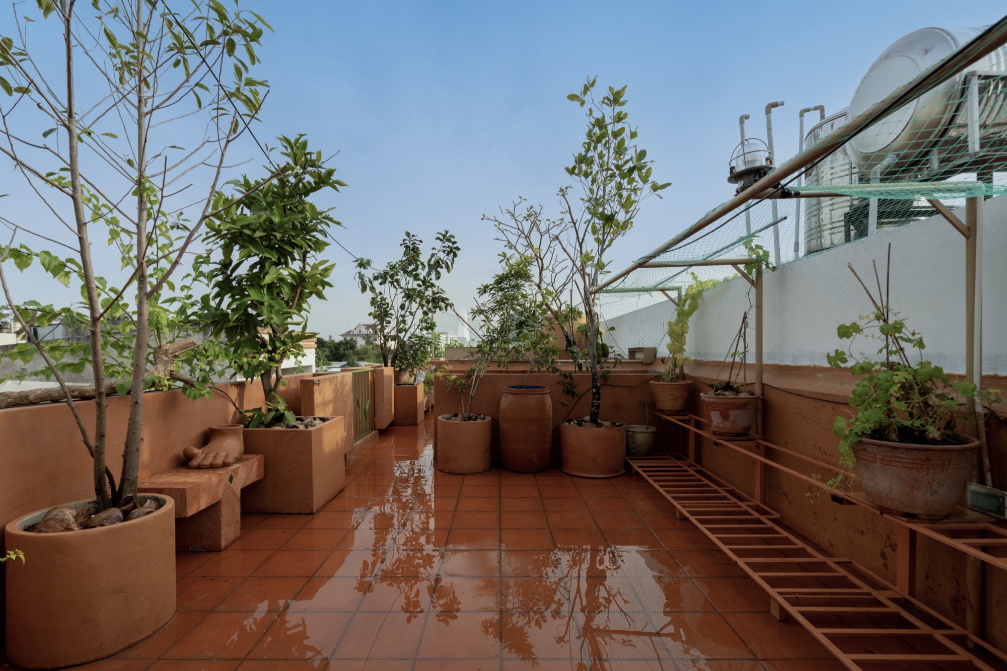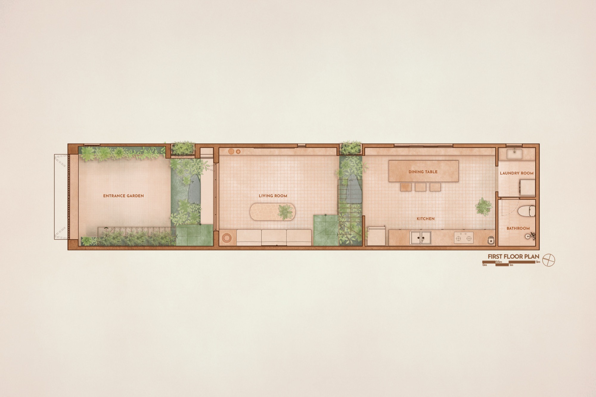 Lấy cảm hứng từ truyền thống gốm Lái Thiêu, thiết kế gợi lại tinh thần Nam Bộ thông qua cách xử lý vật liệu và bề mặt. Ngôi nhà được tổ chức như một “chậu đất nung” được nặn lại, gồm ba lớp không gian nối tiếp. Sân hiên đóng vai trò vùng đệm trước khi chuyển vào khu sinh hoạt chính, với các bức tường bo cong và vách ngăn tiết giảm để tăng độ thoáng. Trên cao, sân thượng được sử dụng cho các sinh hoạt chung như ăn uống và tụ họp.