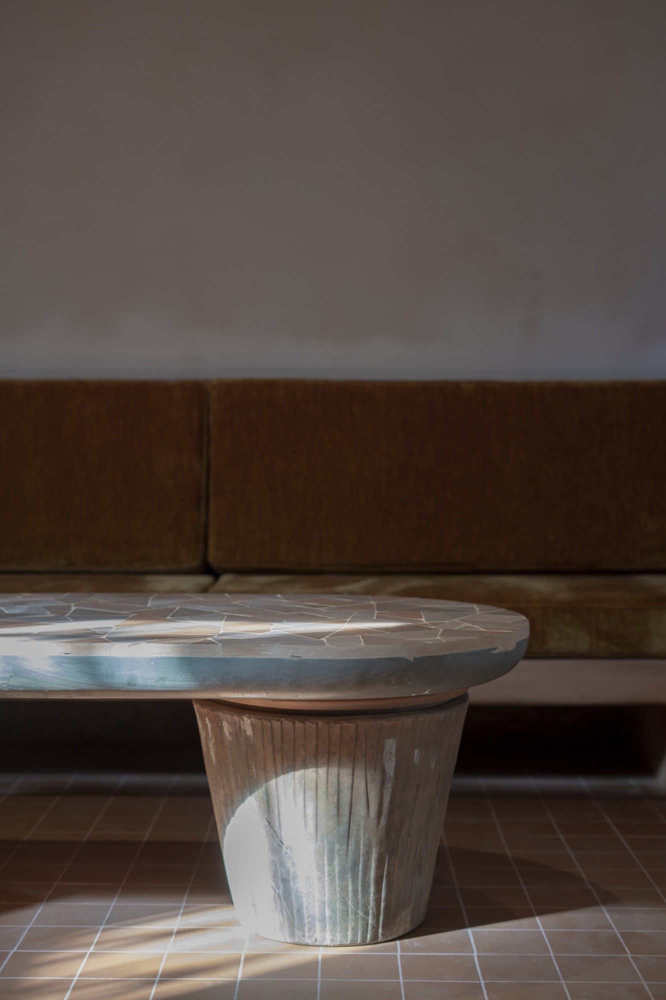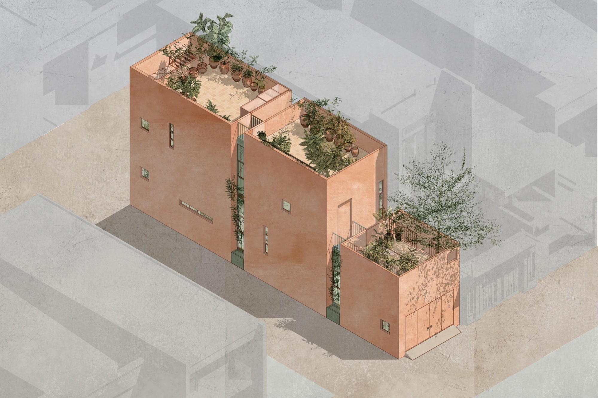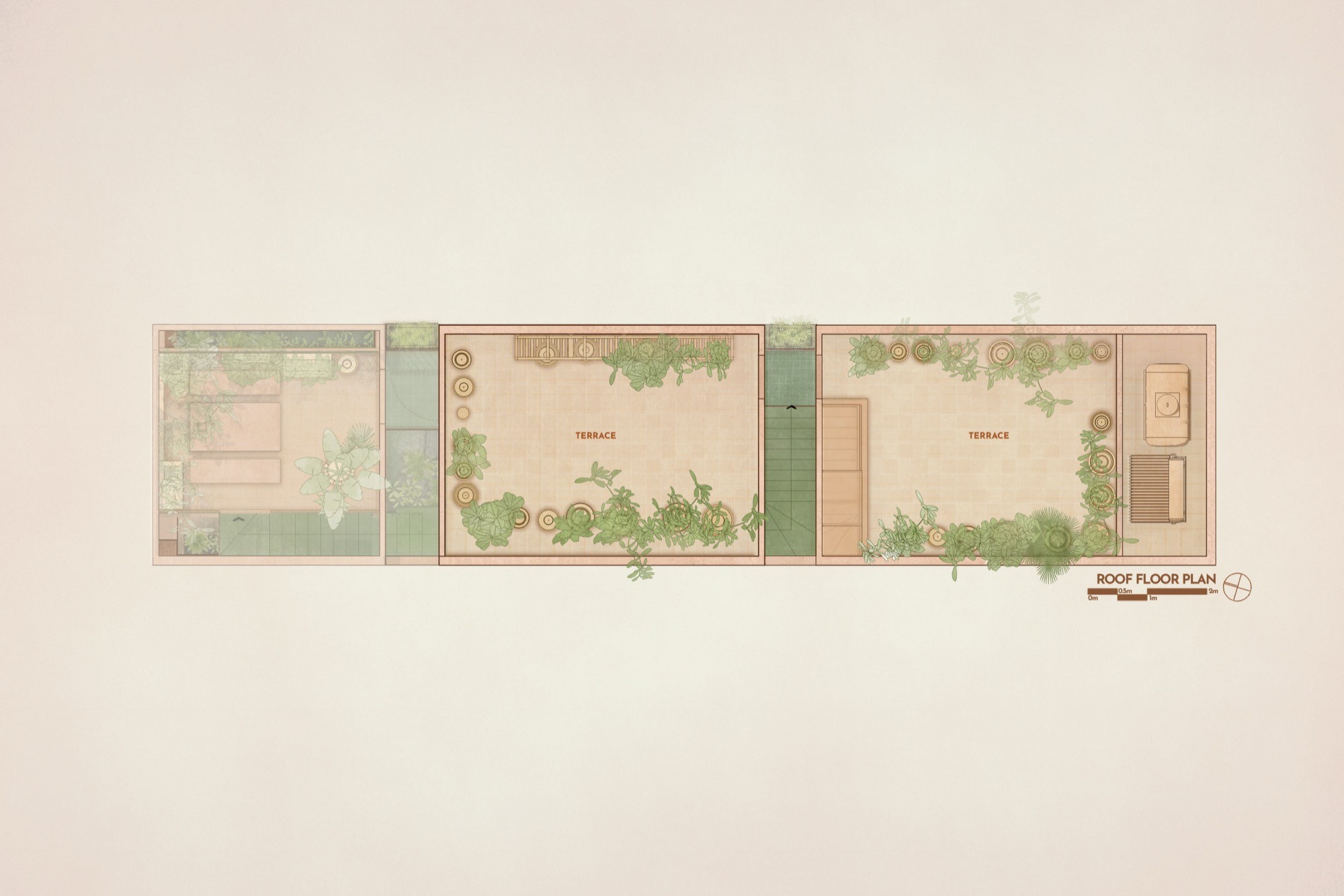 Lấy cảm hứng từ truyền thống gốm Lái Thiêu, thiết kế gợi lại tinh thần Nam Bộ thông qua cách xử lý vật liệu và bề mặt. Ngôi nhà được tổ chức như một “chậu đất nung” được nặn lại, gồm ba lớp không gian nối tiếp. Sân hiên đóng vai trò vùng đệm trước khi chuyển vào khu sinh hoạt chính, với các bức tường bo cong và vách ngăn tiết giảm để tăng độ thoáng. Trên cao, sân thượng được sử dụng cho các sinh hoạt chung như ăn uống và tụ họp.