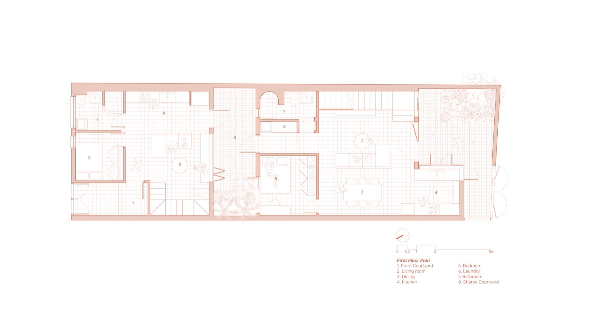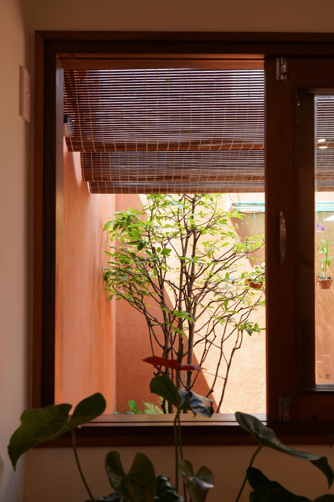 Khoảng sân này không chỉ là giải pháp tổ chức, mà là lõi vận hành của ngôi nhà. Ánh sáng trượt qua các bề mặt gạch, gió di chuyển giữa những khoảng mở, cây xanh chen vào các ranh giới. Tất cả tạo nên một hệ vi khí hậu tự nhiên, đồng thời định hình cách các thành viên gặp gỡ và duy trì khoảng cách cần thiết. Kiến trúc, trong trường hợp này, không áp đặt mà âm thầm thiết lập điều kiện cho các tương tác diễn ra.