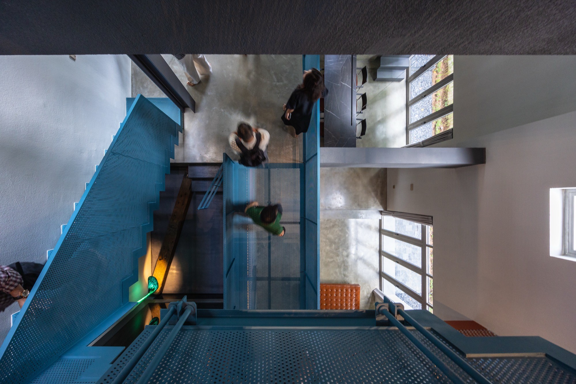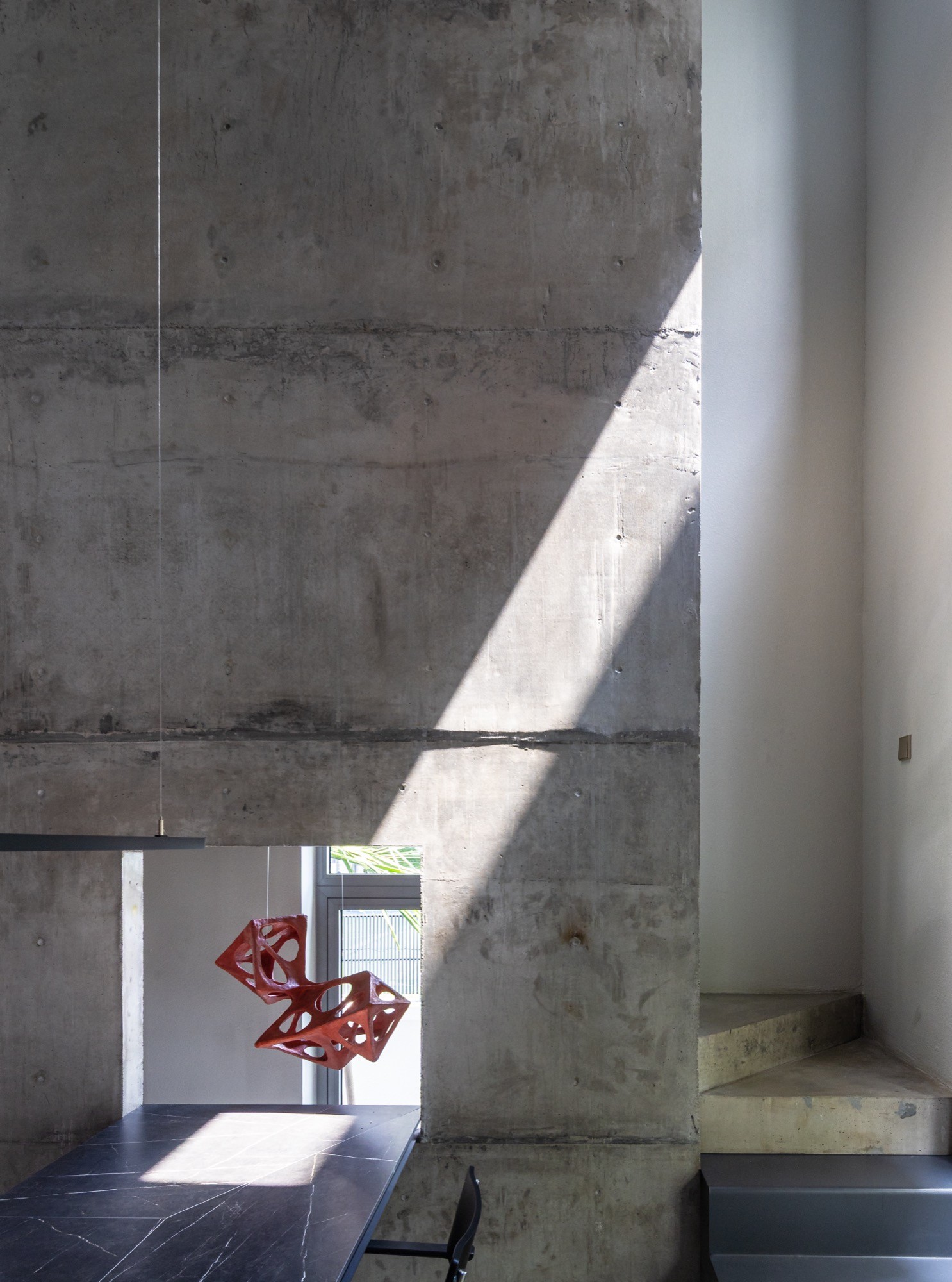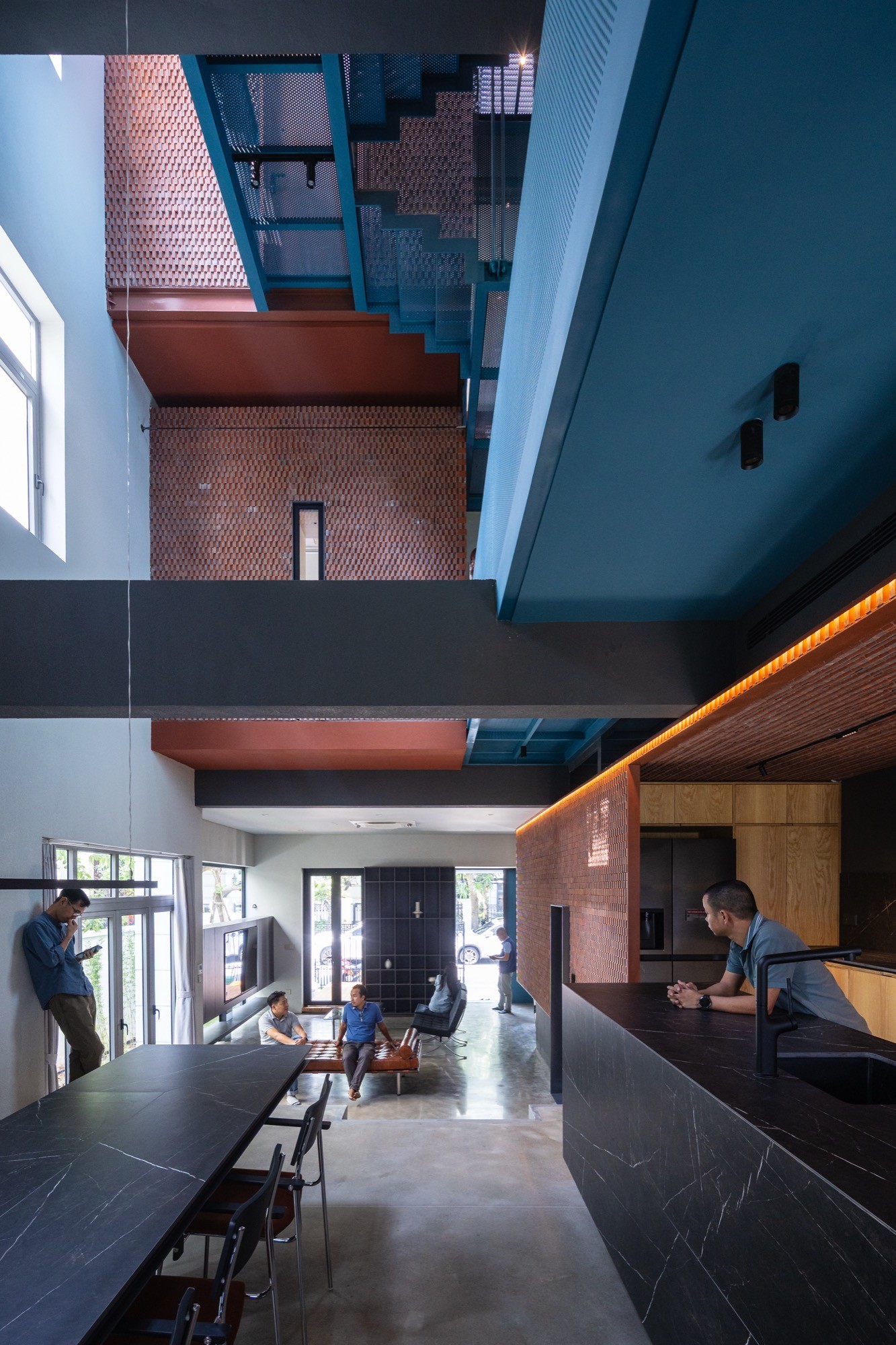 Thay vì tạo ra khác biệt ở mặt đứng, nhóm thiết kế tập trung điều chỉnh những không gian chức năng bên trong. Tận dụng dạng thức phổ biến của nhà ở đô thị Việt Nam với cầu thang ở trung tâm, không gian nội thất được “nới lỏng” bằng những khoảng lệch tầng, tạo ra nhiều lớp không gian đan xen. Tính kết nối không còn dừng ở phương ngang hay dọc, mà chuyển tiếp tuyến tính qua ở từng không gian liên kết như hành lang, cầu thang và chỗ nghỉ.