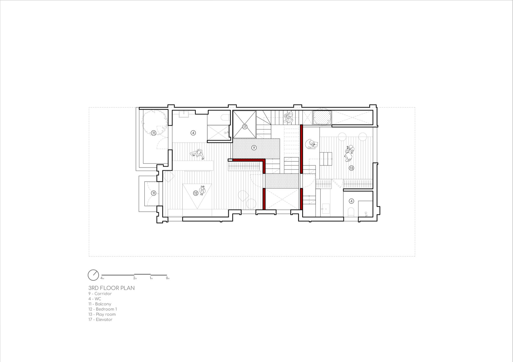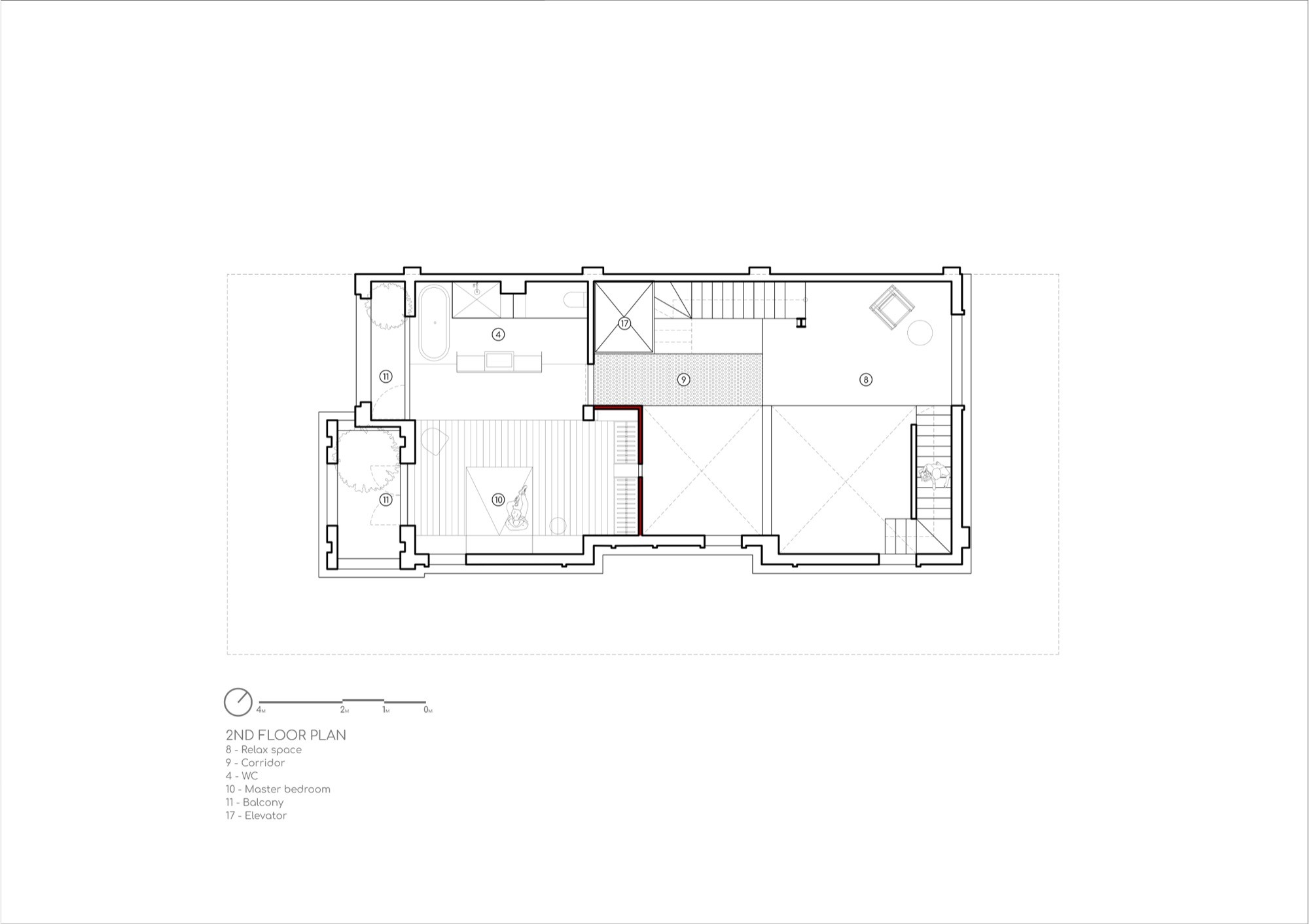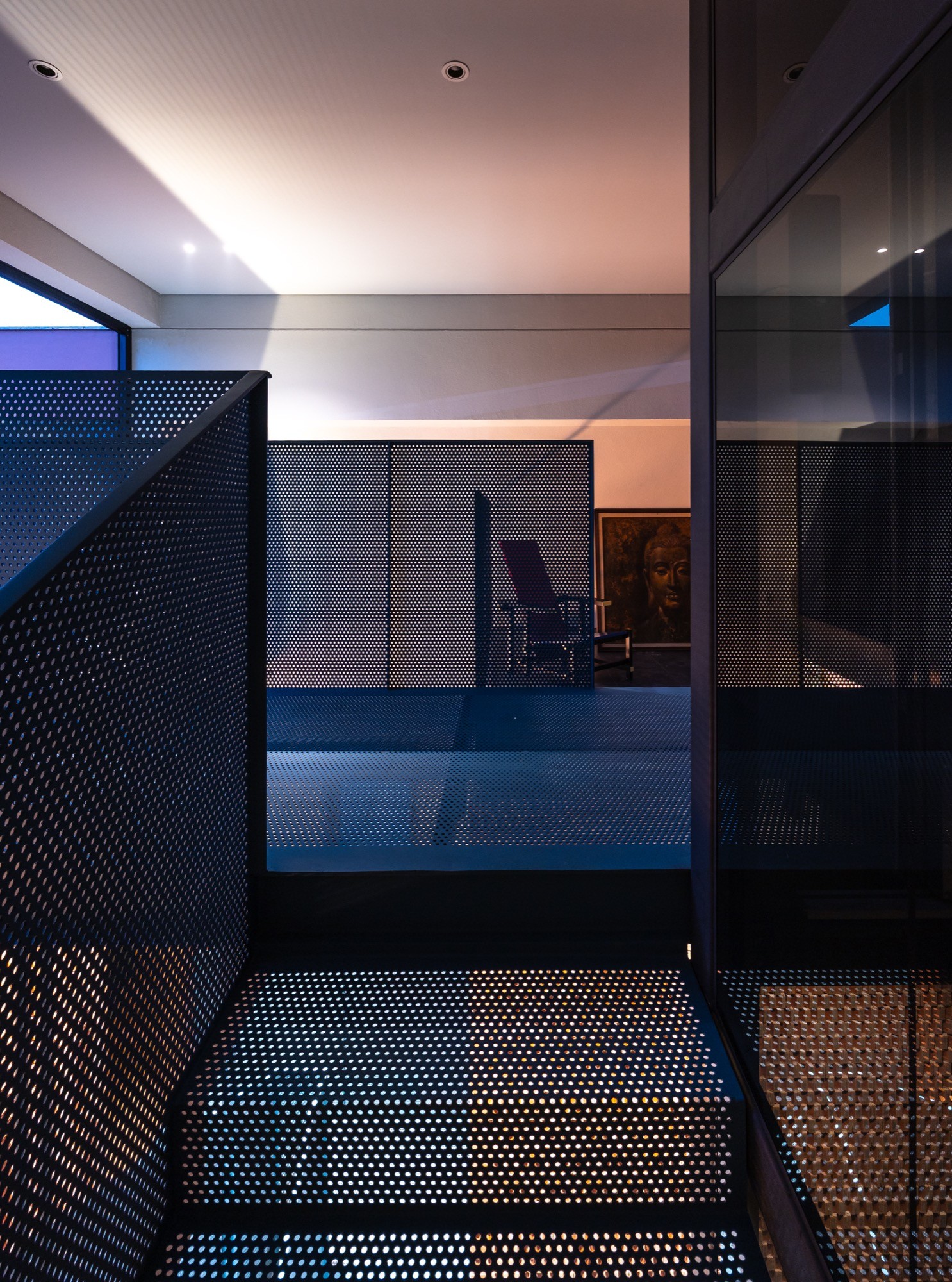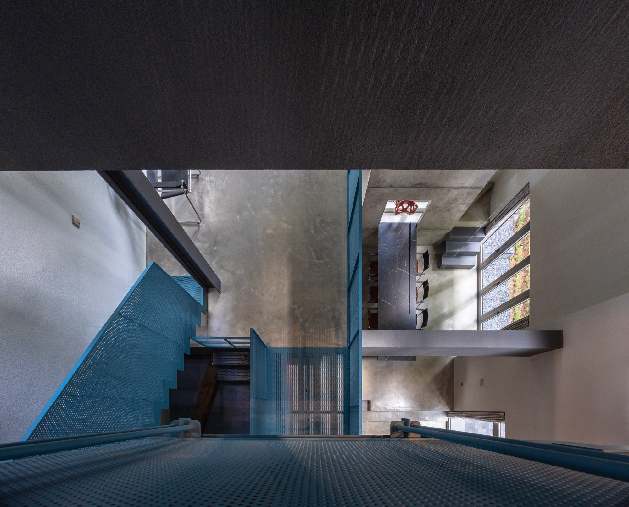 Thay vì tạo ra khác biệt ở mặt đứng, nhóm thiết kế tập trung điều chỉnh những không gian chức năng bên trong. Tận dụng dạng thức phổ biến của nhà ở đô thị Việt Nam với cầu thang ở trung tâm, không gian nội thất được “nới lỏng” bằng những khoảng lệch tầng, tạo ra nhiều lớp không gian đan xen. Tính kết nối không còn dừng ở phương ngang hay dọc, mà chuyển tiếp tuyến tính qua ở từng không gian liên kết như hành lang, cầu thang và chỗ nghỉ.