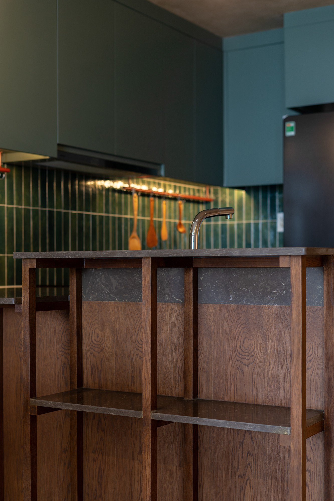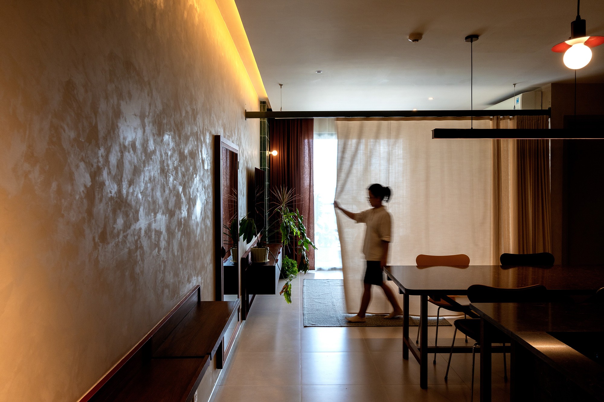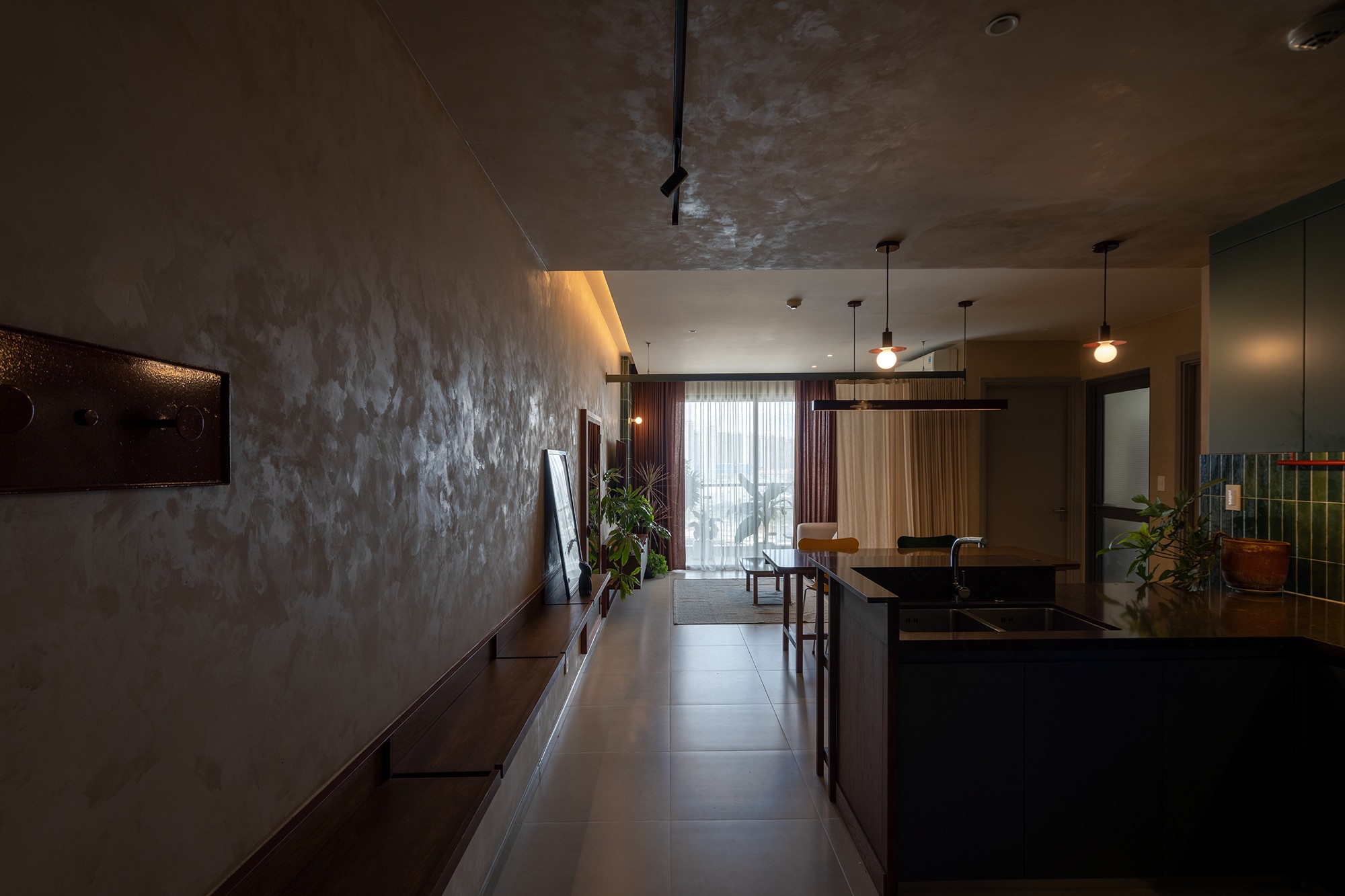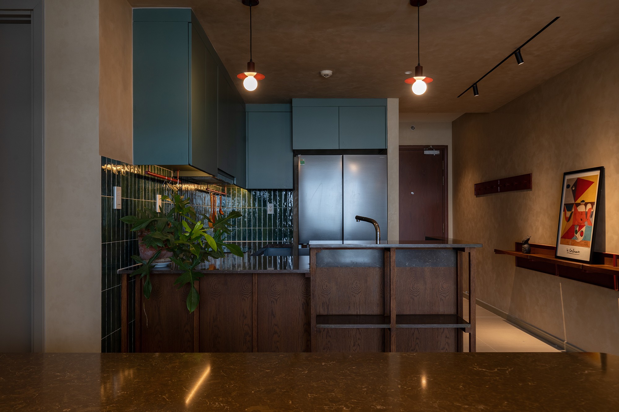 Các can thiệp vì thế luôn ở trạng thái “vừa đủ”. Một lớp rèm linen mỏng, khi khép lại, làm dịu ánh sáng và biến đổi chức năng; hệ tủ bếp xanh đậm, mảng gạch bóng và bề mặt gỗ tối tạo nên chiều sâu thị giác, như những lớp nền chồng lên nhau. Ánh sáng điểm rơi xuống từng vị trí, giữ nhịp cho không gian thay vì chiếu sáng đồng đều.