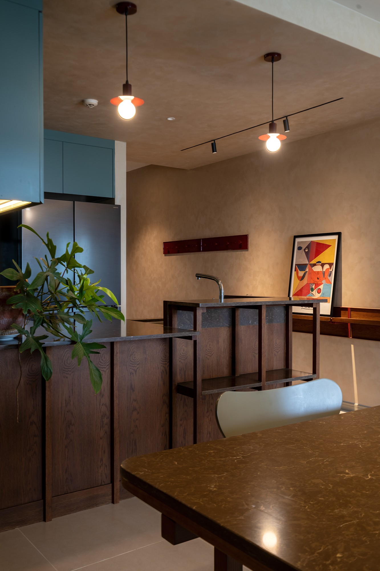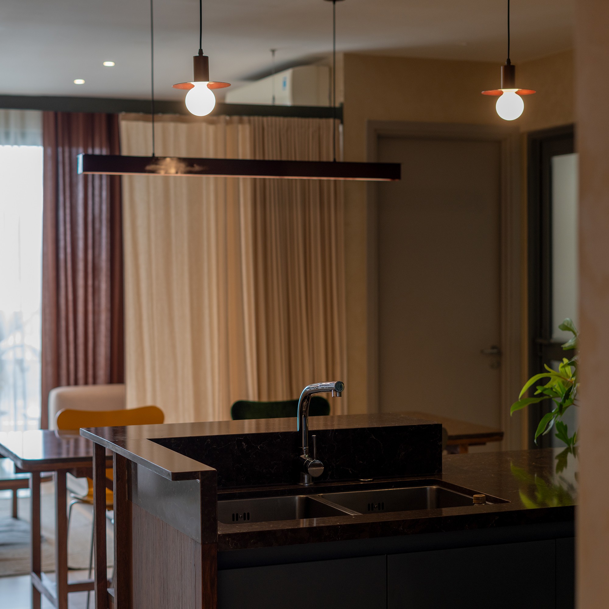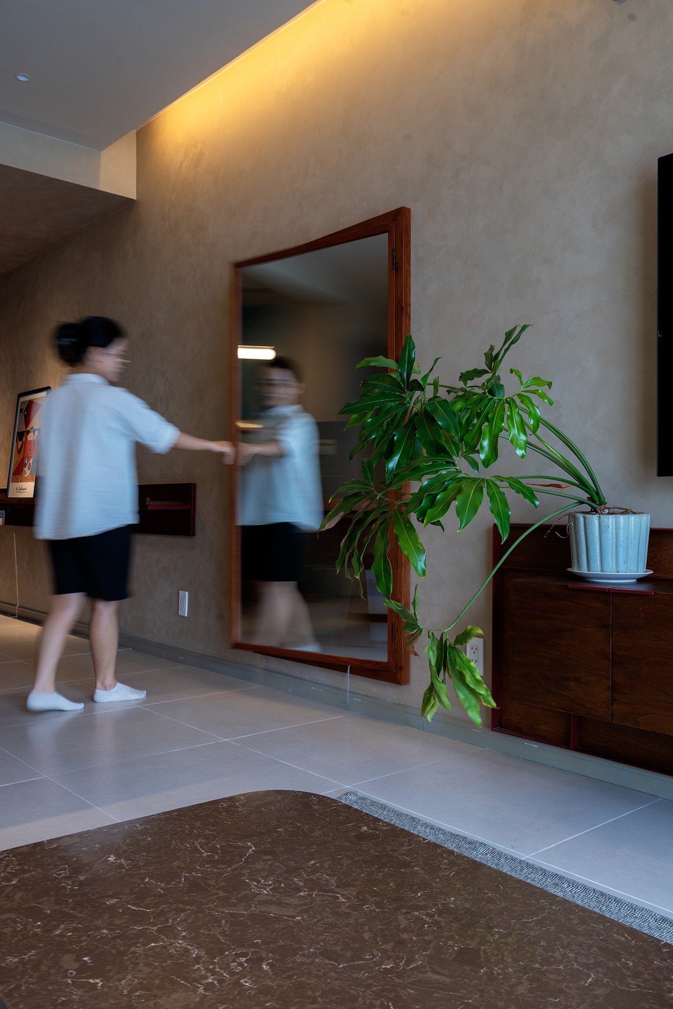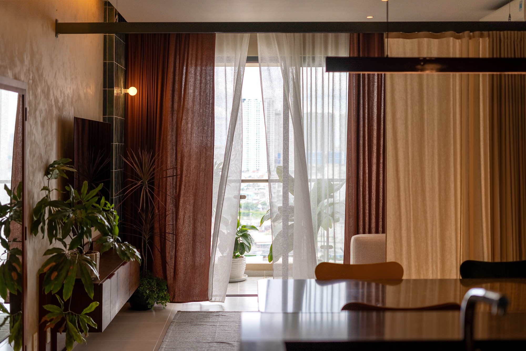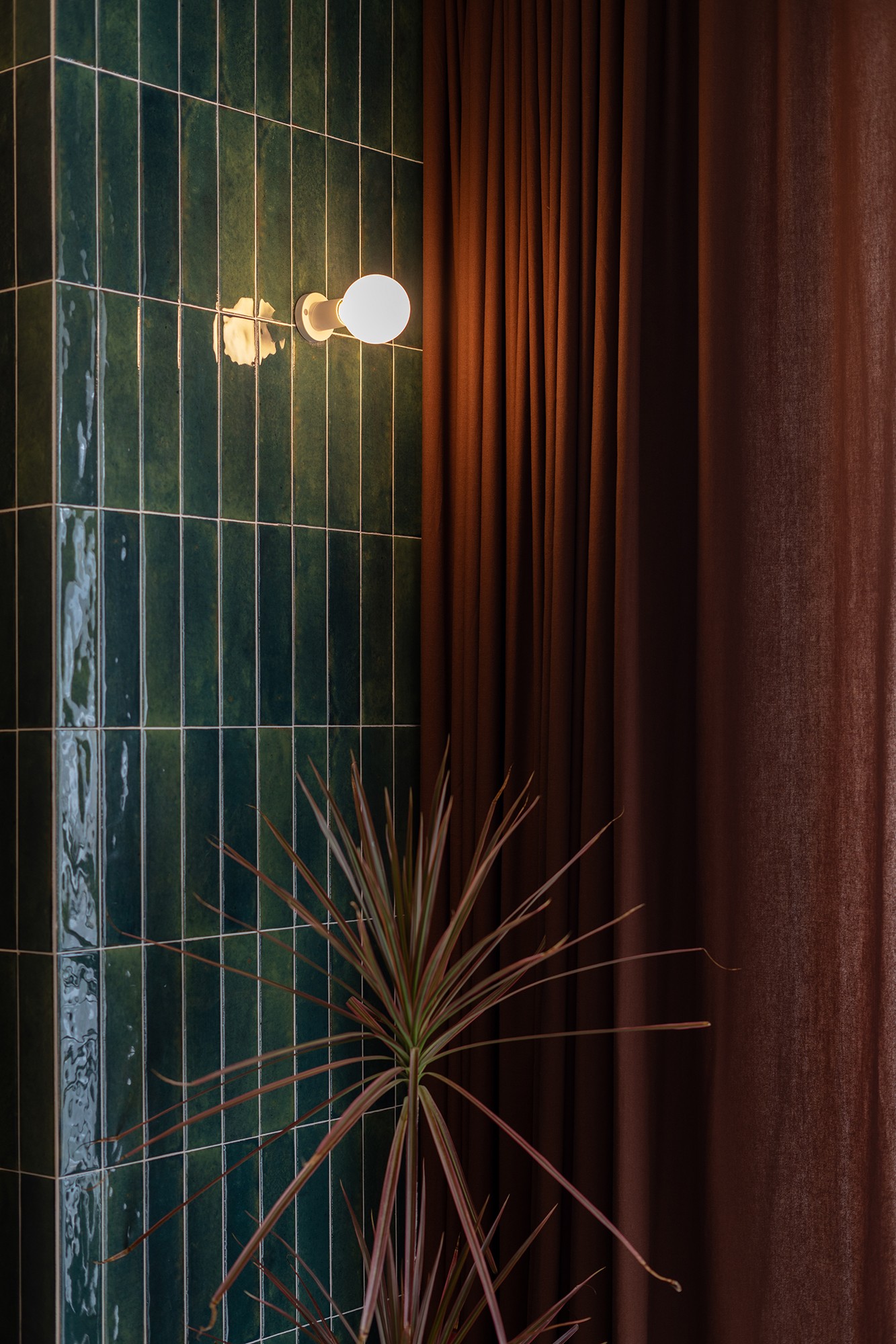 Các can thiệp vì thế luôn ở trạng thái “vừa đủ”. Một lớp rèm linen mỏng, khi khép lại, làm dịu ánh sáng và biến đổi chức năng; hệ tủ bếp xanh đậm, mảng gạch bóng và bề mặt gỗ tối tạo nên chiều sâu thị giác, như những lớp nền chồng lên nhau. Ánh sáng điểm rơi xuống từng vị trí, giữ nhịp cho không gian thay vì chiếu sáng đồng đều.