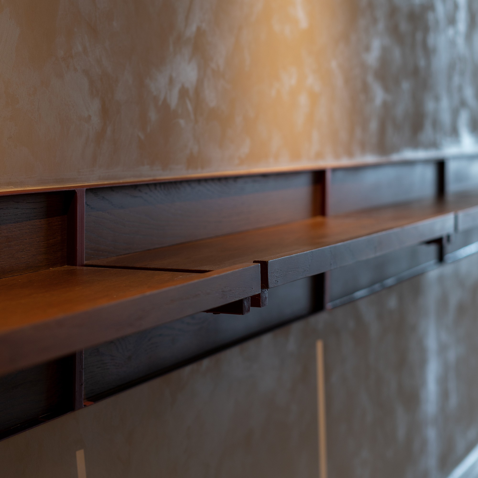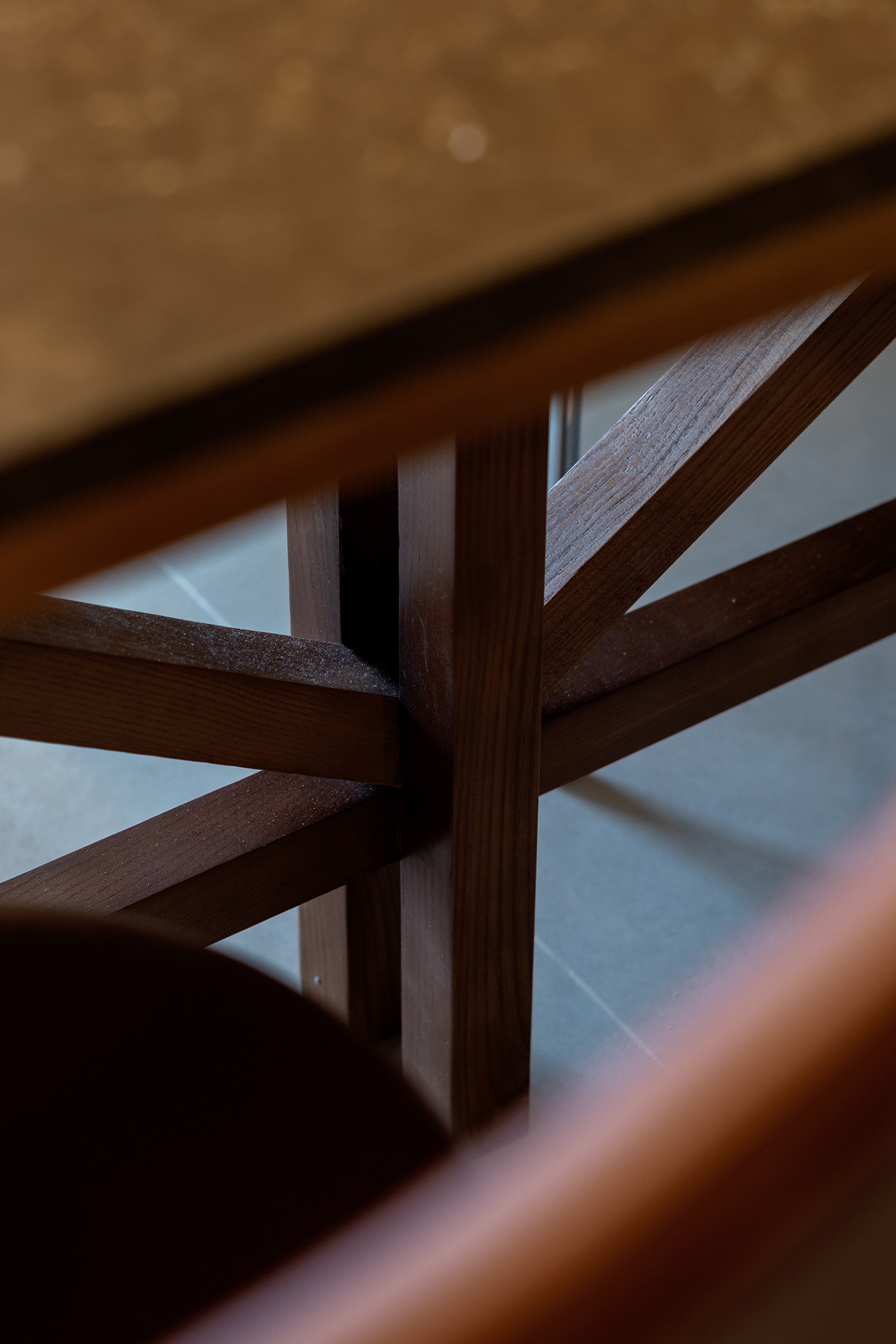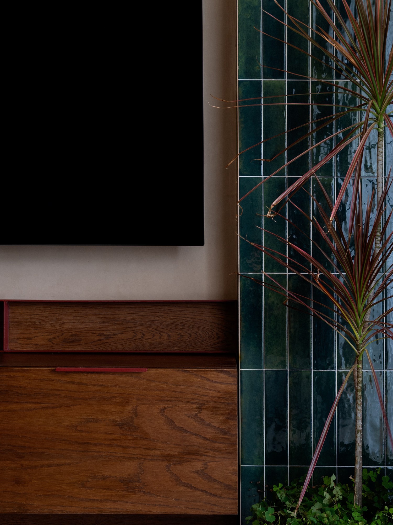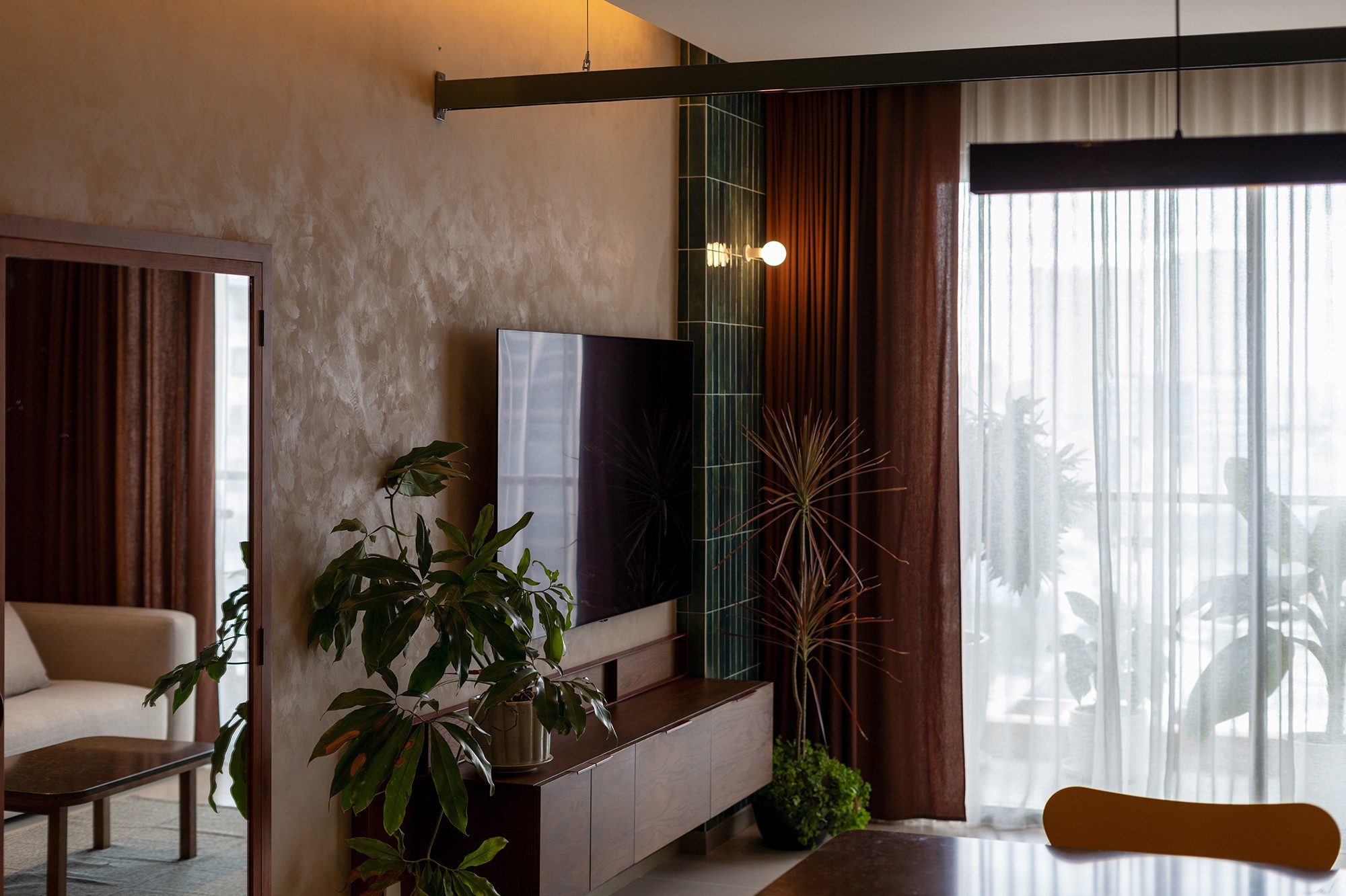 Các can thiệp vì thế luôn ở trạng thái “vừa đủ”. Một lớp rèm linen mỏng, khi khép lại, làm dịu ánh sáng và biến đổi chức năng; hệ tủ bếp xanh đậm, mảng gạch bóng và bề mặt gỗ tối tạo nên chiều sâu thị giác, như những lớp nền chồng lên nhau. Ánh sáng điểm rơi xuống từng vị trí, giữ nhịp cho không gian thay vì chiếu sáng đồng đều.