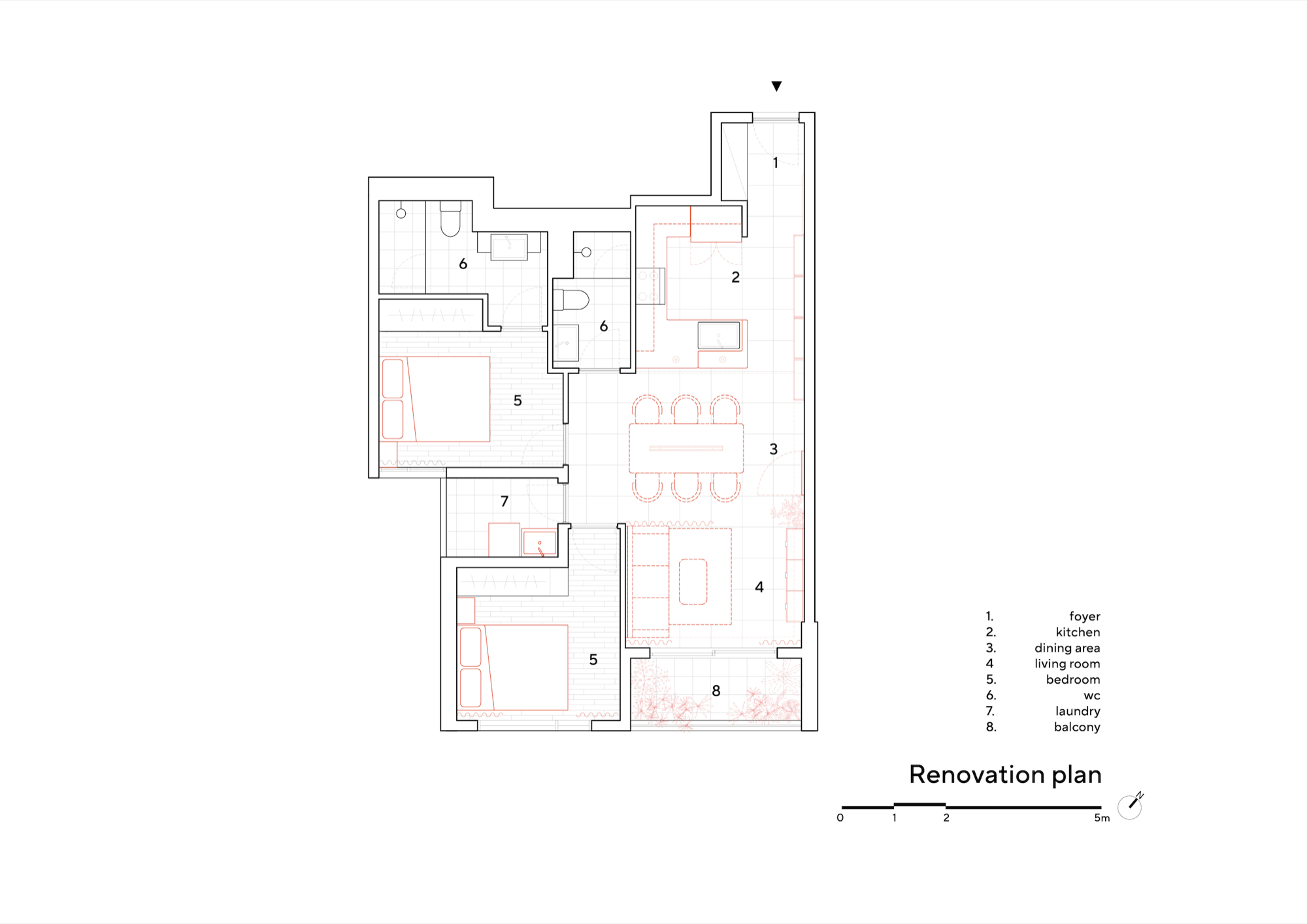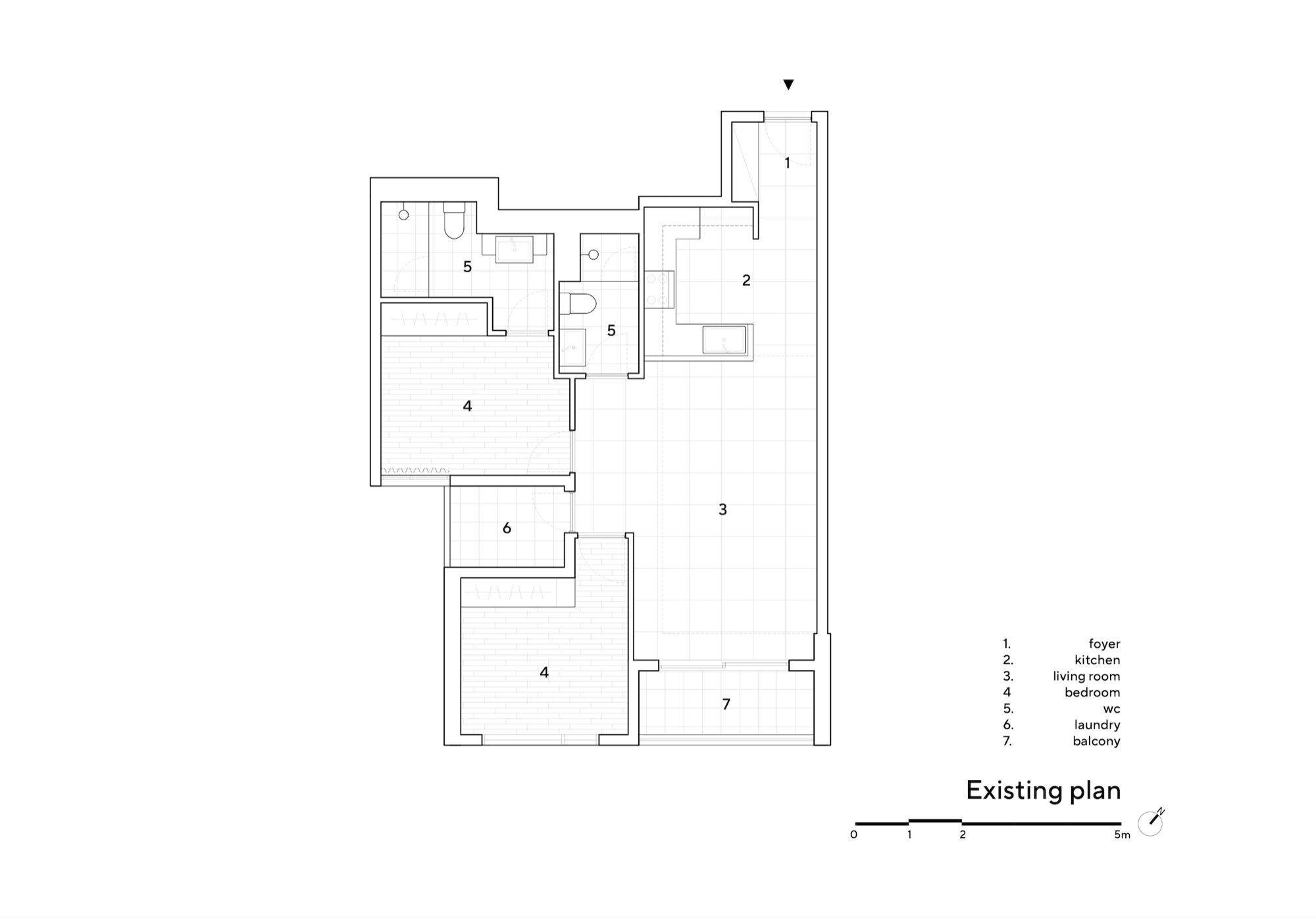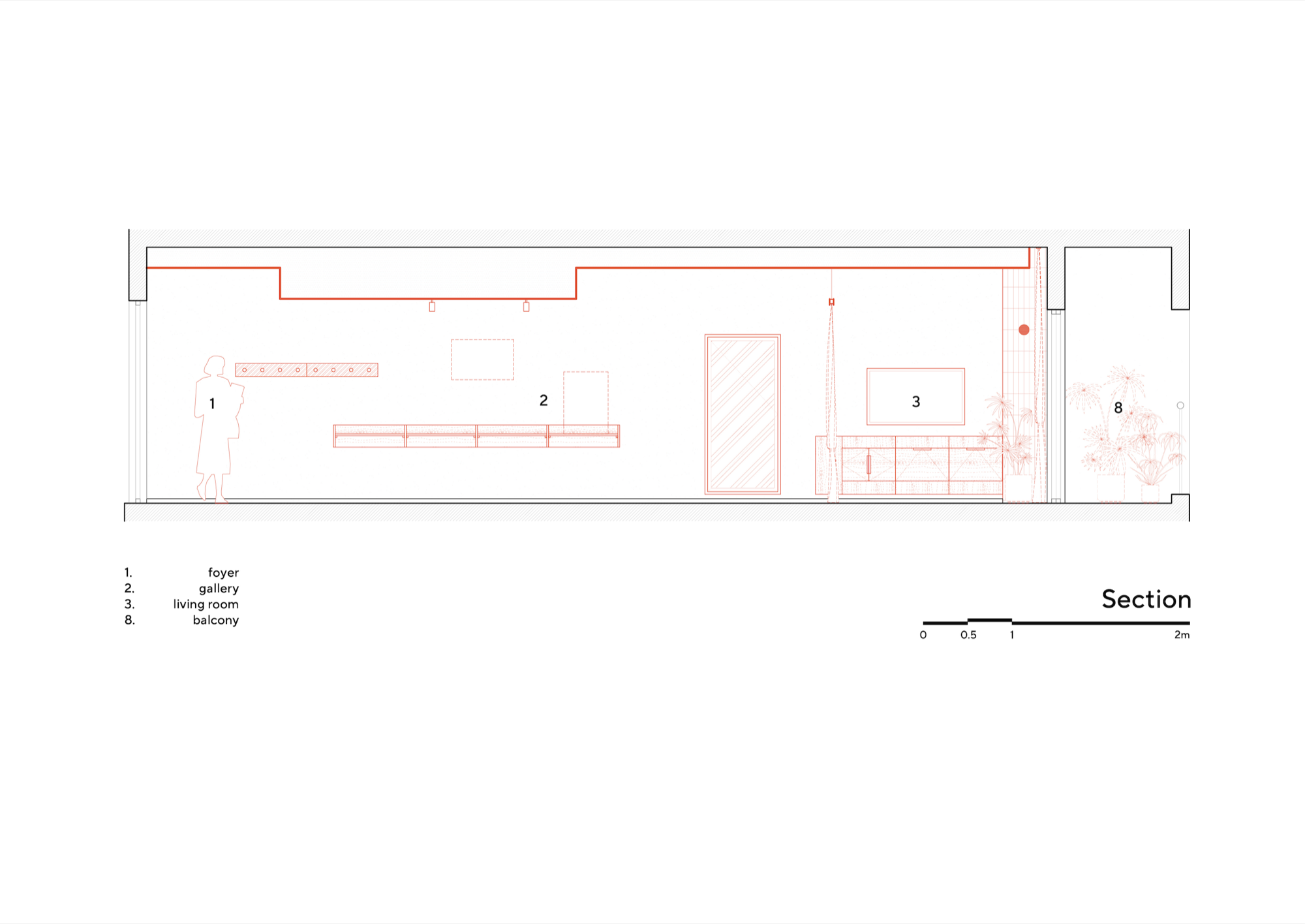 Flat #02 hiện ra như một lát cắt điển hình của đời sống đô thị: hẹp, sâu và gần như khép kín trong những giới hạn sẵn có. Thay vì “làm mới” bằng thay thế, nhóm thiết kế chọn giữ lại cấu trúc và vật liệu hiện hữu, và dịch chuyển trọng tâm sang việc tái tổ chức không gian sống.
