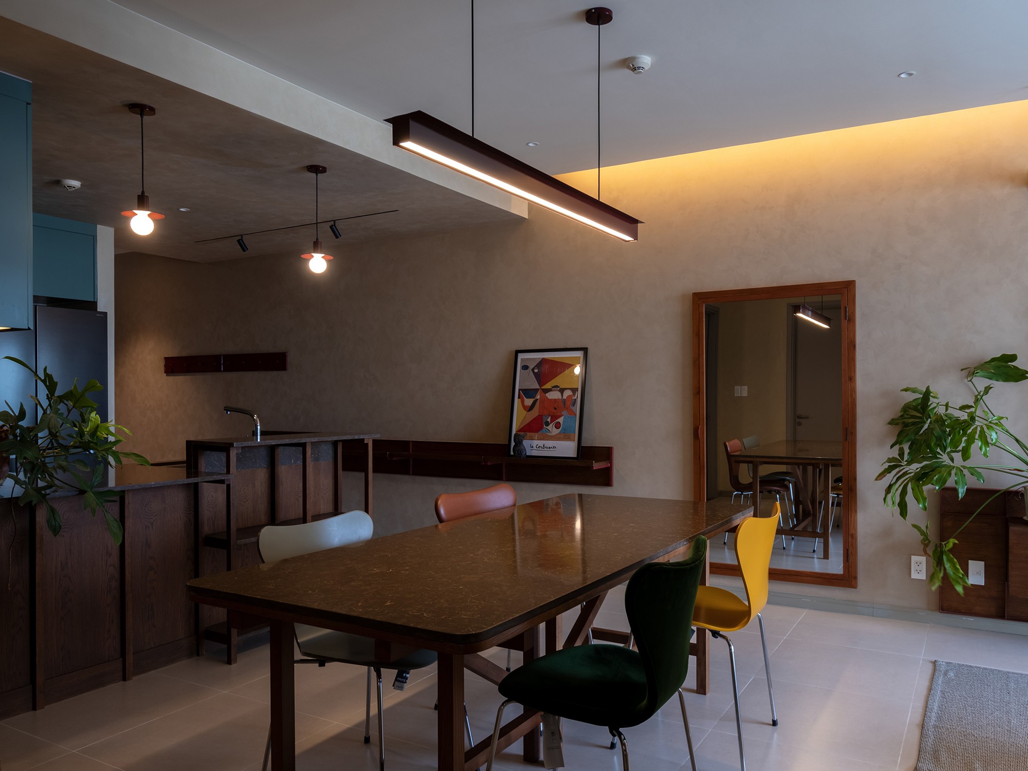 Trần nhà, trong dự án này, không còn là bề mặt trung tính mà trở thành công cụ định hình. Những chuyển tiếp cao độ, cùng lớp ánh sáng ấm chạy dọc, tạo nên một nhịp điệu không gian rõ ràng: từ khu bếp nén lại, trầm và đặc, đến vùng sinh hoạt phía trong thoáng hơn, mềm hơn. Không cần vách ngăn, các lớp không gian vẫn được nhận diện bằng cảm giác.