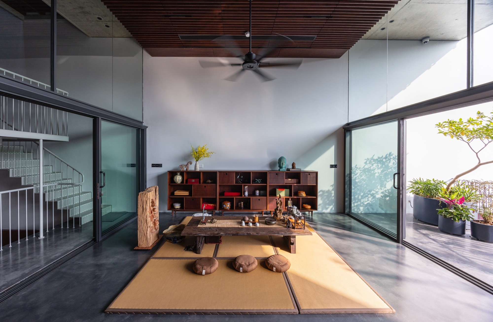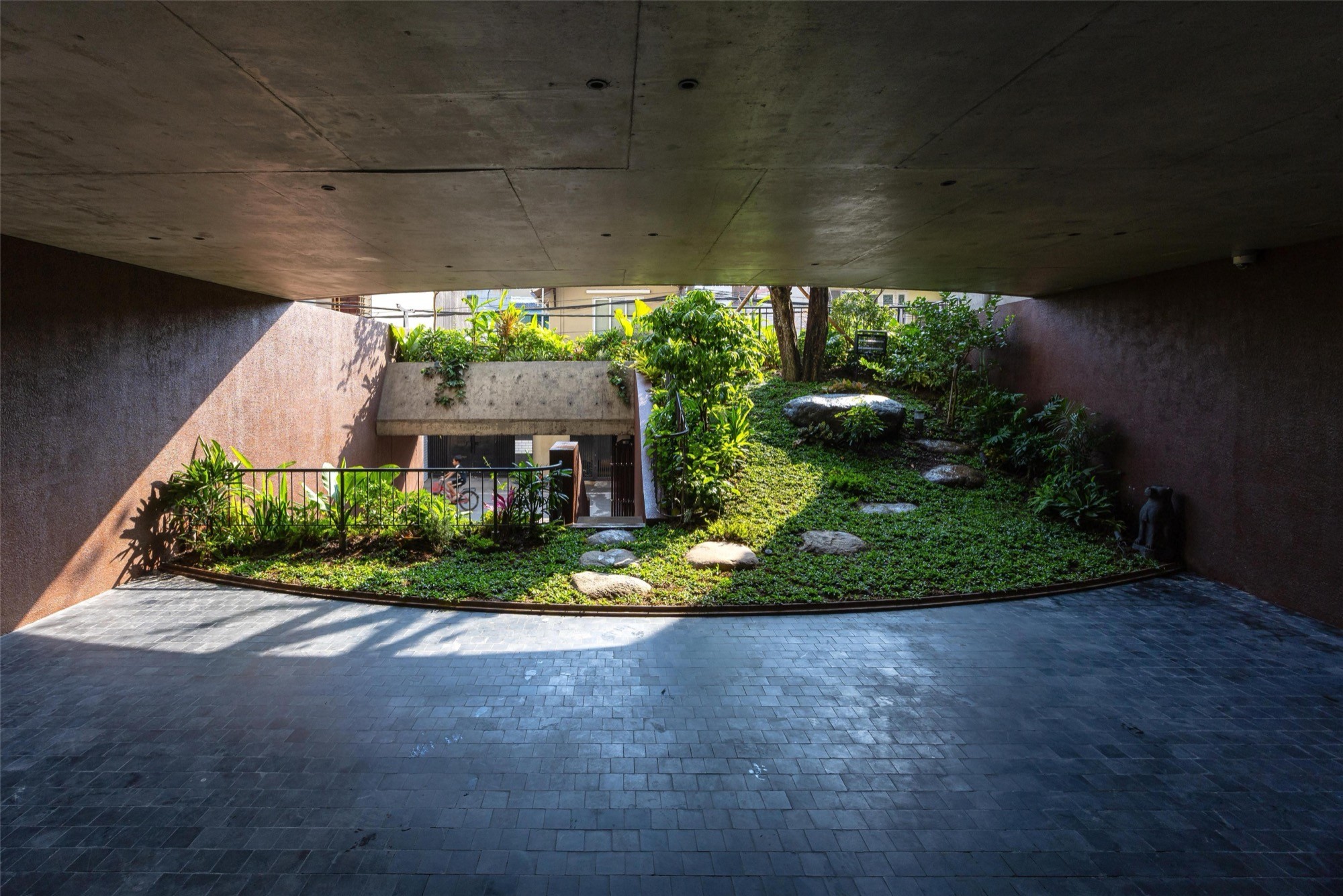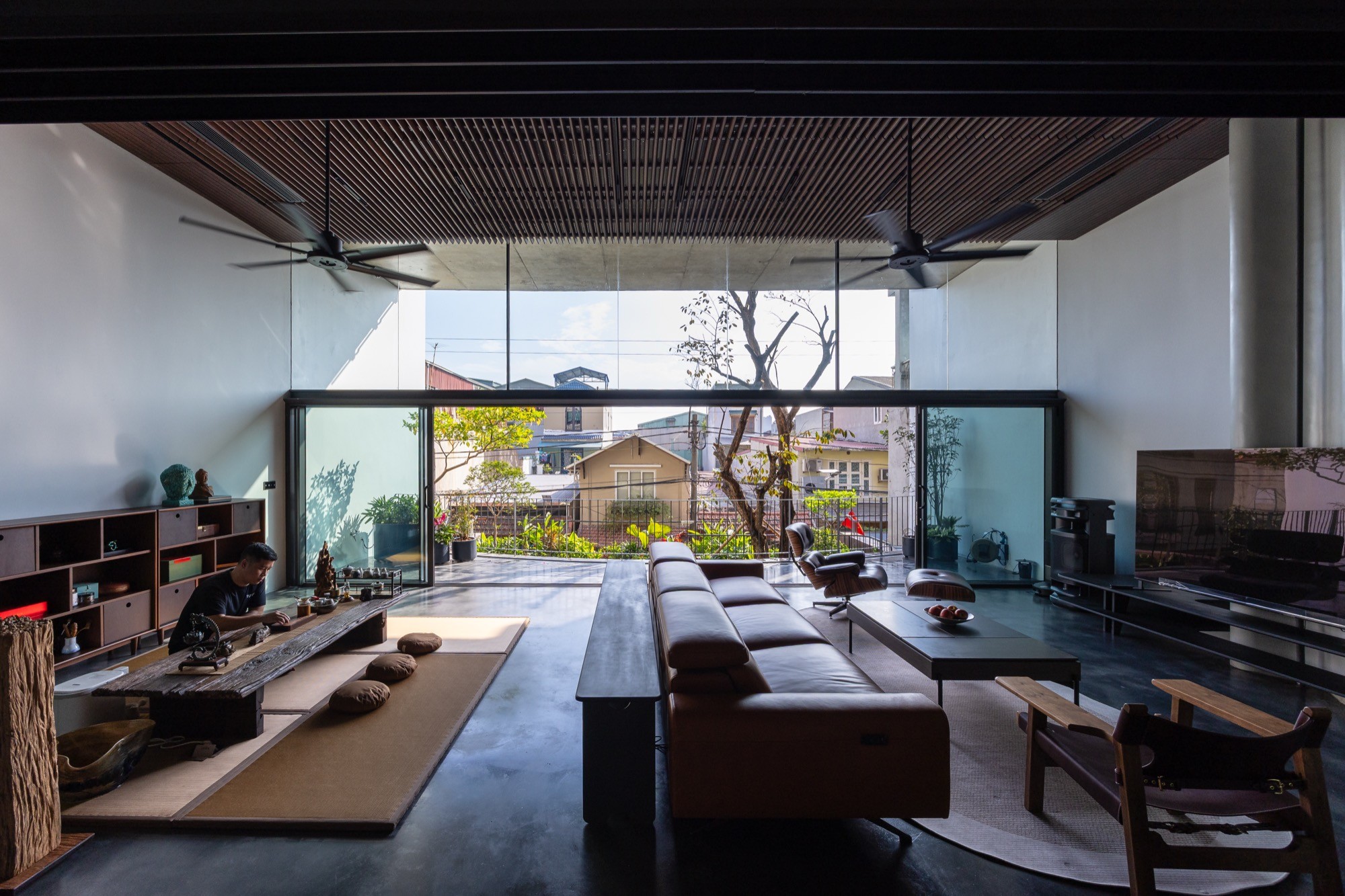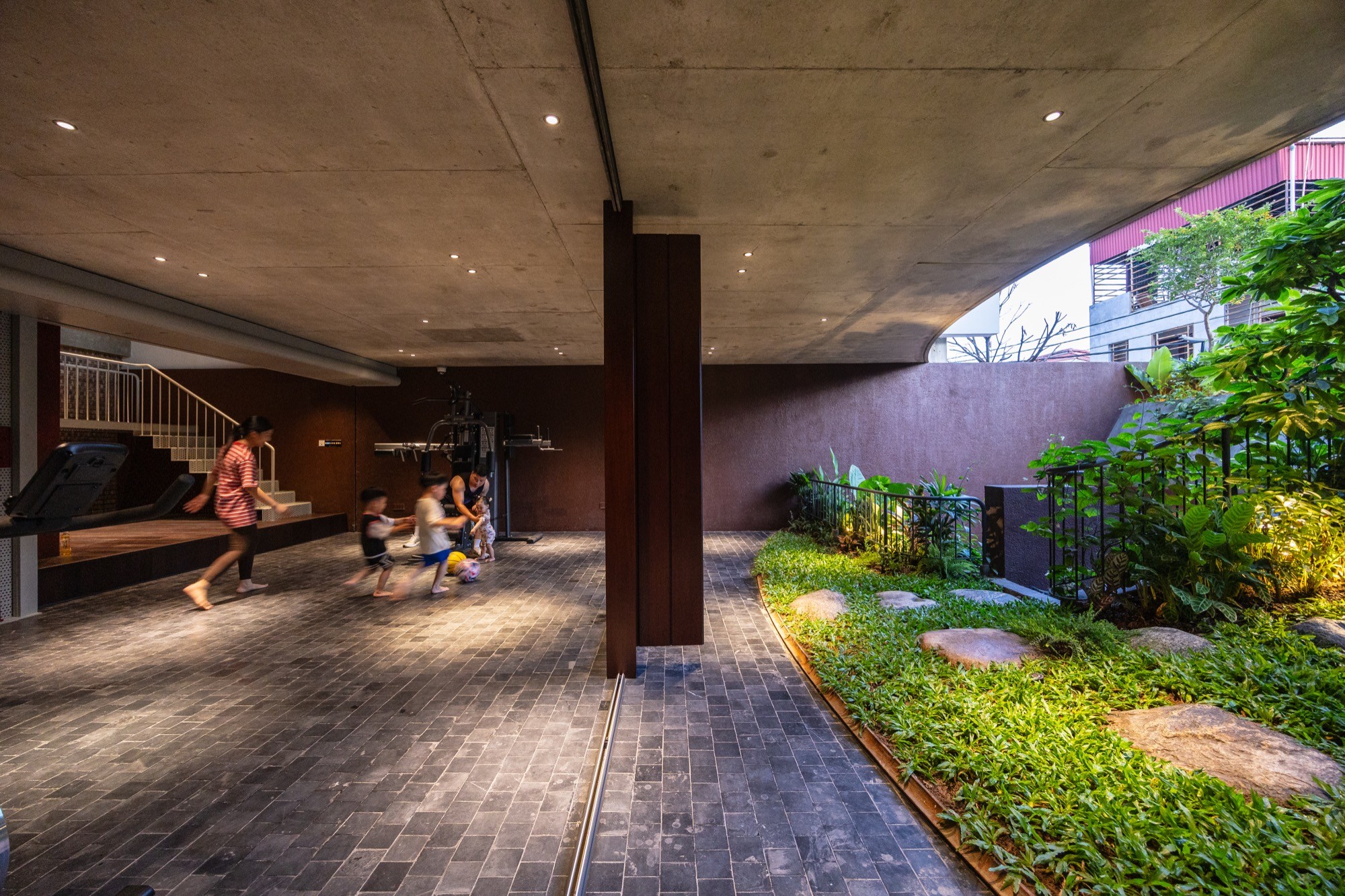 Khu vườn phía trước được nâng cao, tạo thành khoảng đệm tách biệt với phố. Dốc thoải từ vườn xuống sân chơi giúp mở rộng mặt bằng, đồng thời tăng diện tích cây xanh. Các lớp lam và hệ cây trồng được bố trí nhằm kiểm soát ánh sáng và đảm bảo riêng tư mà không gây cảm giác khép kín. Tầng một là sân chơi kết hợp hiên gỗ, nơi các thành viên có thể sinh hoạt hoặc thư giãn. Tầng hai là phòng khách và khu thưởng trà, kết nối trực tiếp với vườn và khoảng thông tầng. Hệ cửa kính hai lớp có thể mở linh hoạt, cho phép điều chỉnh độ thoáng và độ riêng tư. Tầng ba và bốn bố trí phòng ngủ và không gian sinh hoạt chung, xoay quanh giếng trời để tăng kết nối thị giác và thông gió chéo. Mặt đứng được xử lý hai lớp gồm kính và lam che nắng tự động nhằm giảm bức xạ nhiệt và cải thiện vi khí hậu.