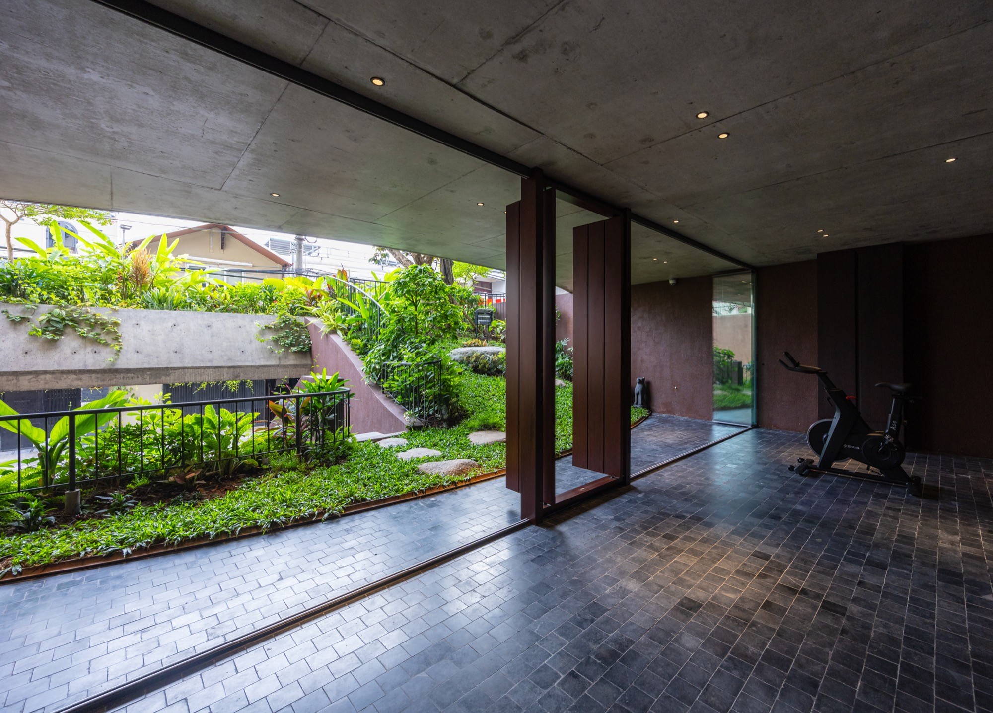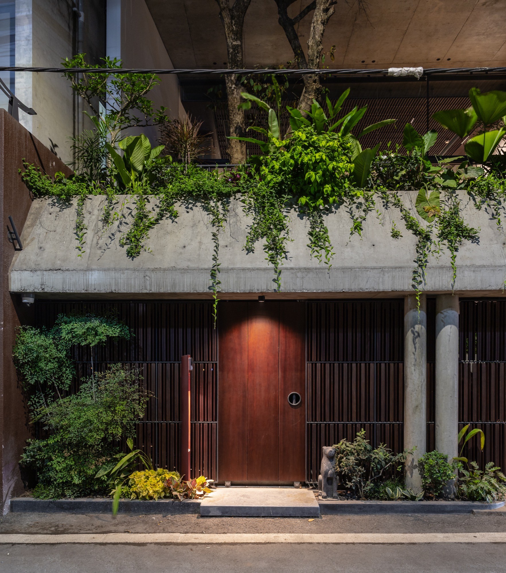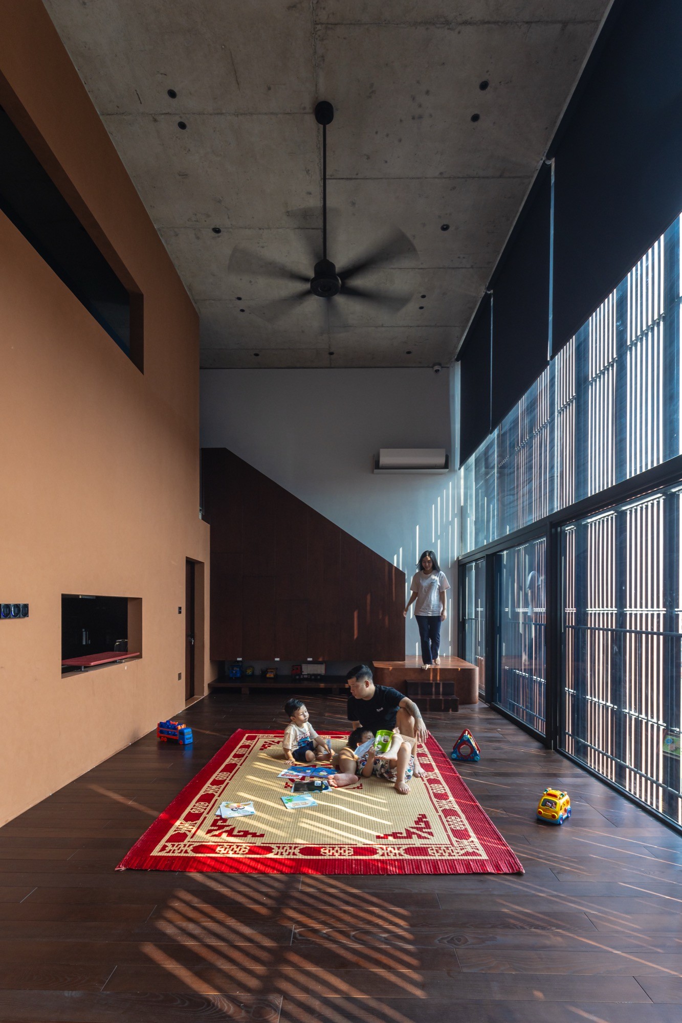 Khu vườn phía trước được nâng cao, tạo thành khoảng đệm tách biệt với phố. Dốc thoải từ vườn xuống sân chơi giúp mở rộng mặt bằng, đồng thời tăng diện tích cây xanh. Các lớp lam và hệ cây trồng được bố trí nhằm kiểm soát ánh sáng và đảm bảo riêng tư mà không gây cảm giác khép kín. Tầng một là sân chơi kết hợp hiên gỗ, nơi các thành viên có thể sinh hoạt hoặc thư giãn. Tầng hai là phòng khách và khu thưởng trà, kết nối trực tiếp với vườn và khoảng thông tầng. Hệ cửa kính hai lớp có thể mở linh hoạt, cho phép điều chỉnh độ thoáng và độ riêng tư. Tầng ba và bốn bố trí phòng ngủ và không gian sinh hoạt chung, xoay quanh giếng trời để tăng kết nối thị giác và thông gió chéo. Mặt đứng được xử lý hai lớp gồm kính và lam che nắng tự động nhằm giảm bức xạ nhiệt và cải thiện vi khí hậu.