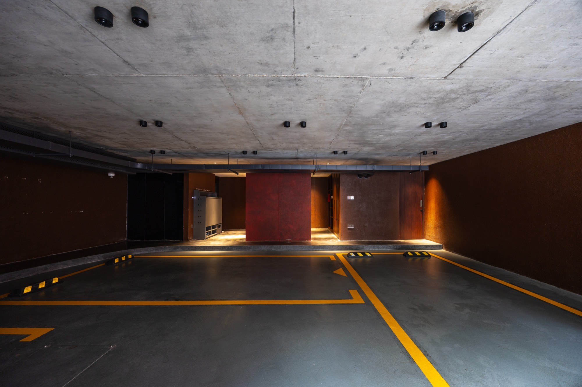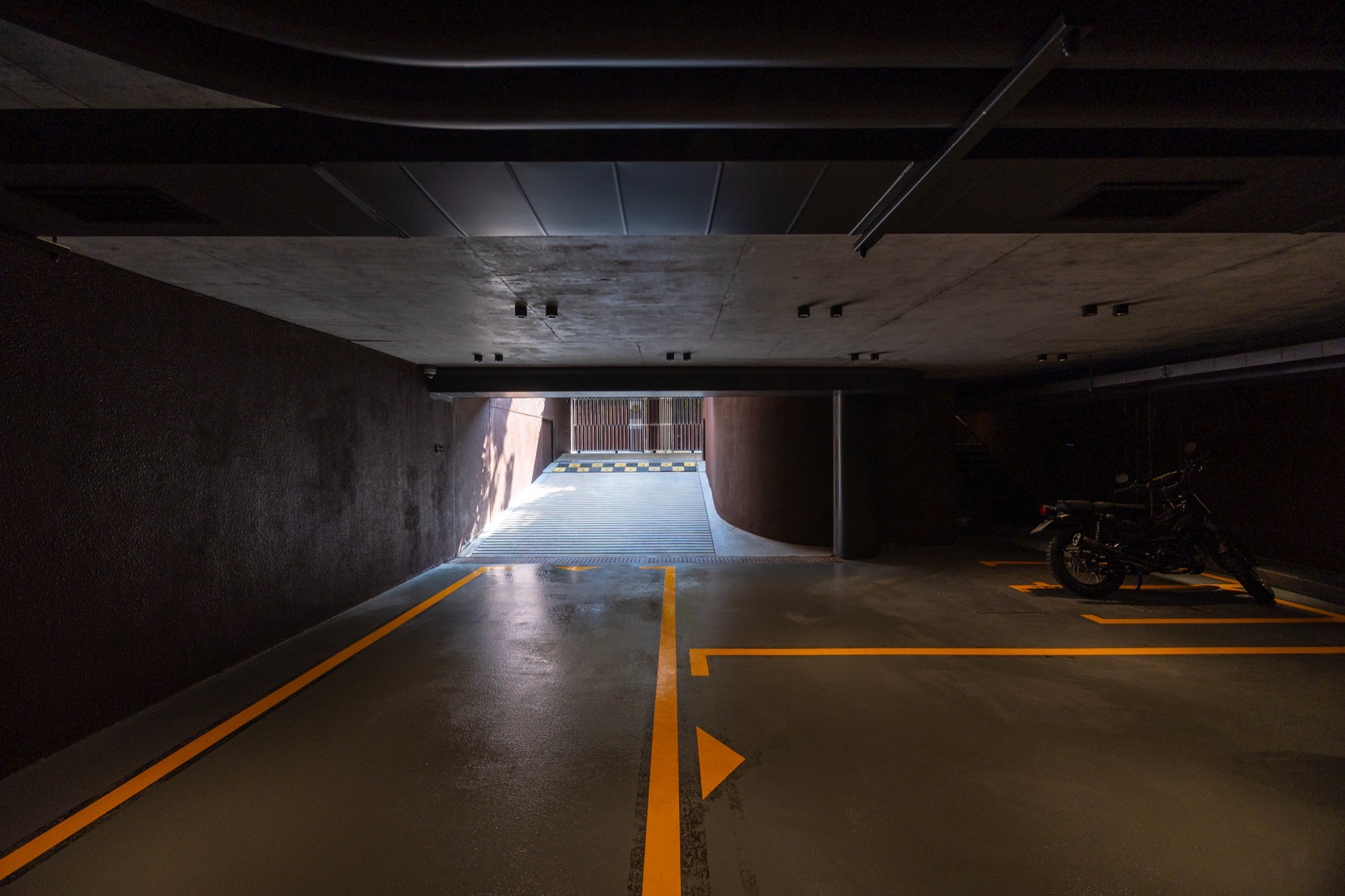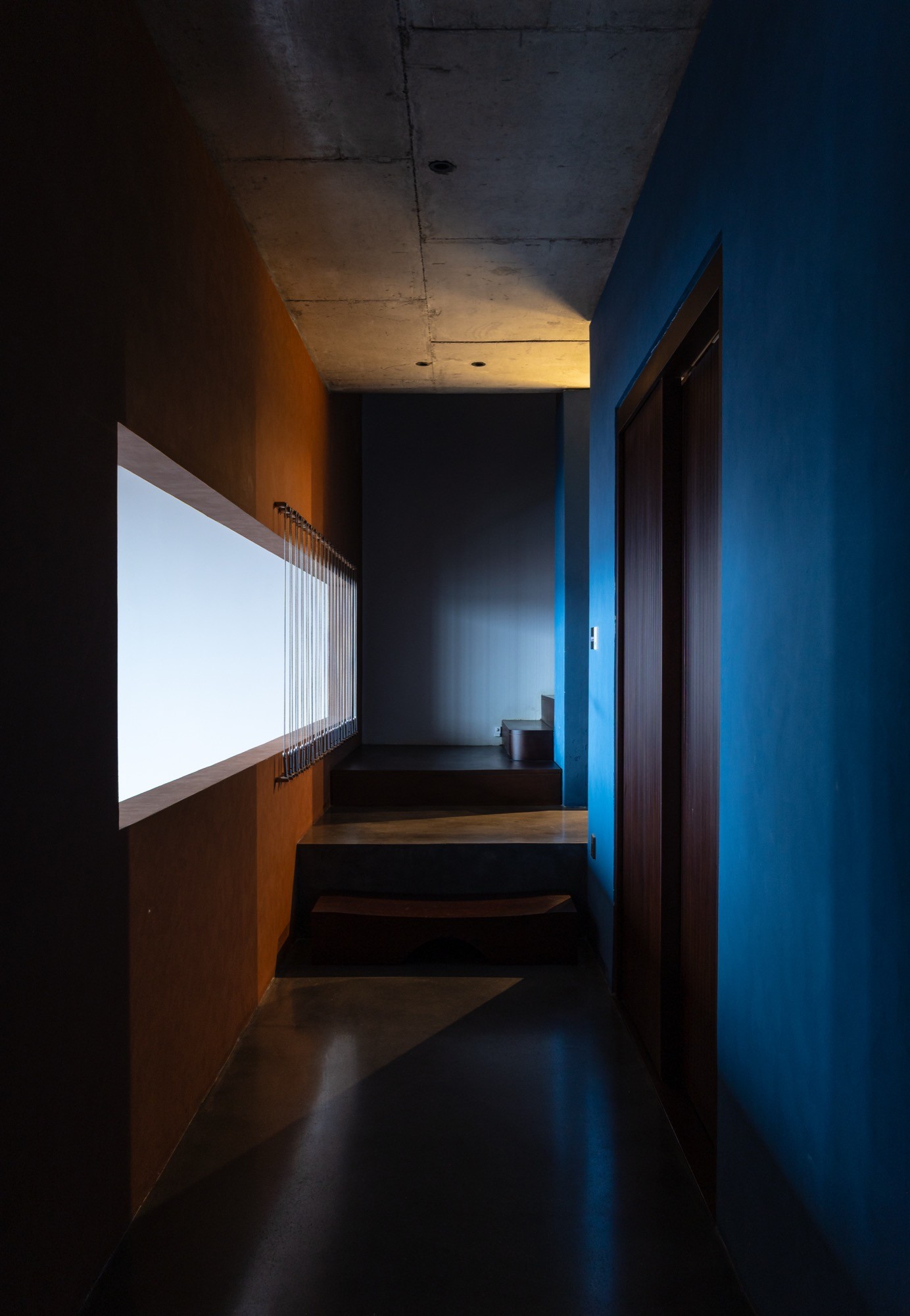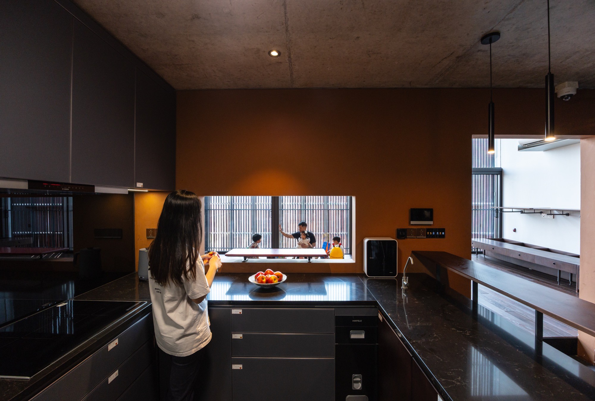 Khu vườn phía trước được nâng cao, tạo thành khoảng đệm tách biệt với phố. Dốc thoải từ vườn xuống sân chơi giúp mở rộng mặt bằng, đồng thời tăng diện tích cây xanh. Các lớp lam và hệ cây trồng được bố trí nhằm kiểm soát ánh sáng và đảm bảo riêng tư mà không gây cảm giác khép kín. Tầng một là sân chơi kết hợp hiên gỗ, nơi các thành viên có thể sinh hoạt hoặc thư giãn. Tầng hai là phòng khách và khu thưởng trà, kết nối trực tiếp với vườn và khoảng thông tầng. Hệ cửa kính hai lớp có thể mở linh hoạt, cho phép điều chỉnh độ thoáng và độ riêng tư. Tầng ba và bốn bố trí phòng ngủ và không gian sinh hoạt chung, xoay quanh giếng trời để tăng kết nối thị giác và thông gió chéo. Mặt đứng được xử lý hai lớp gồm kính và lam che nắng tự động nhằm giảm bức xạ nhiệt và cải thiện vi khí hậu.