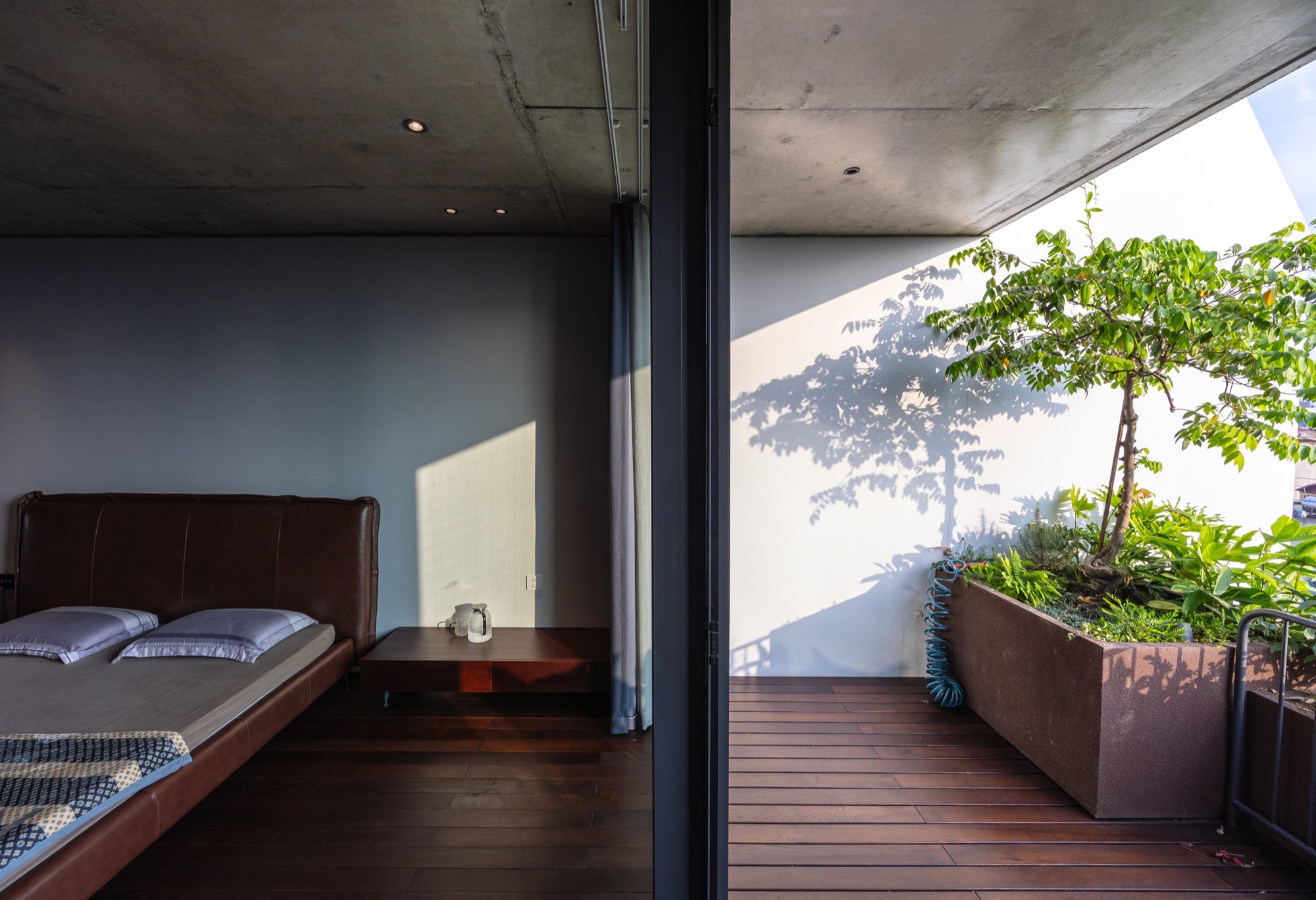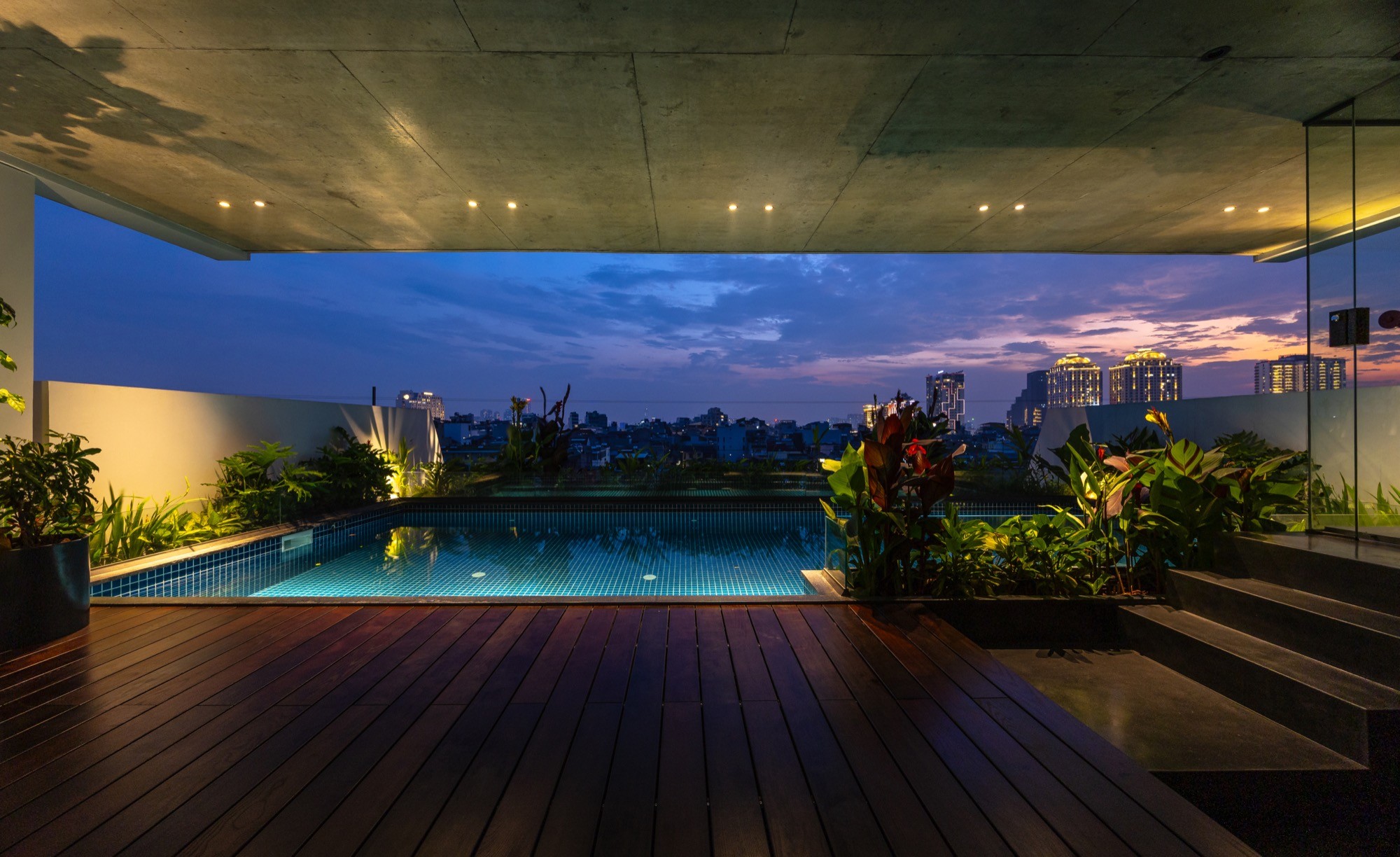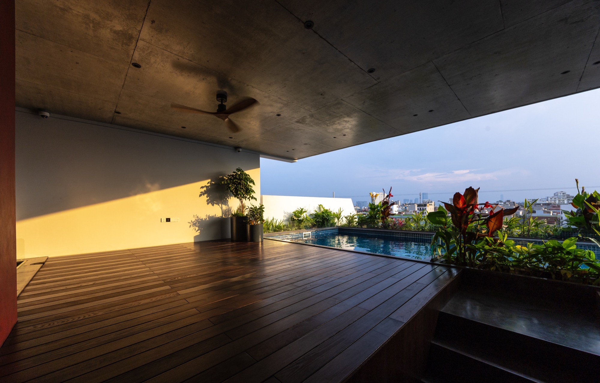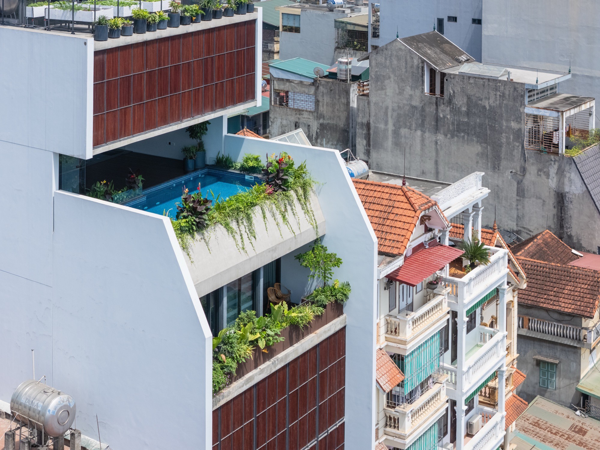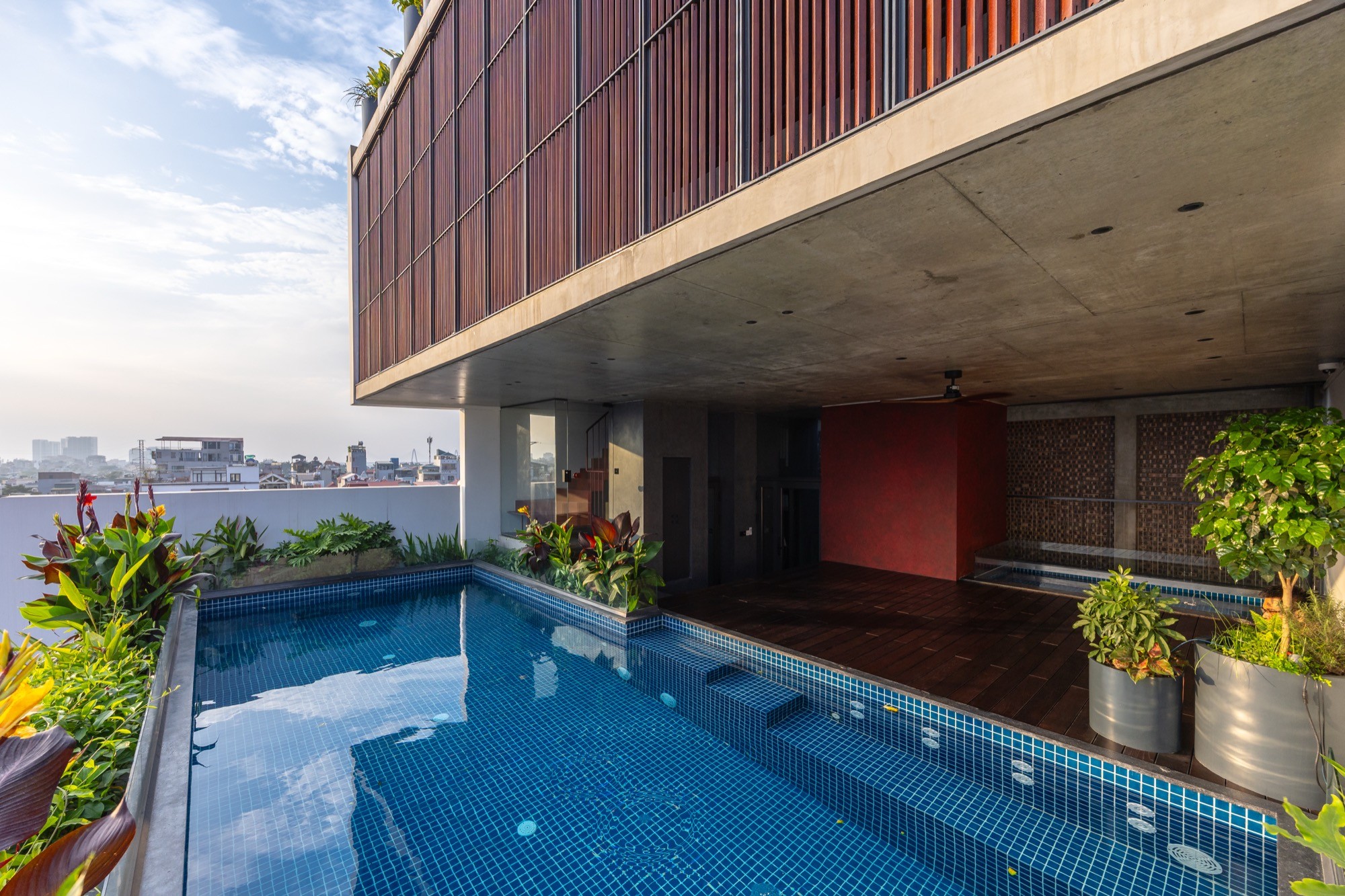 Tầng năm dành cho phòng ngủ chính, tận dụng hướng nhìn ra vườn và ánh sáng từ giếng trời. Tầng sáu là khu sinh hoạt chung với sàn gỗ ngoài trời và bể bơi, được bao quanh bởi cây xanh. Tầng bảy là không gian thờ hướng ra mặt tiền, sử dụng hệ lam gỗ điều khiển tự động để cân bằng ánh sáng và sự trang nghiêm. Trên mái là khu kỹ thuật kết hợp vườn rau nhỏ, mở ra tầm nhìn thoáng và không gian thư giãn.