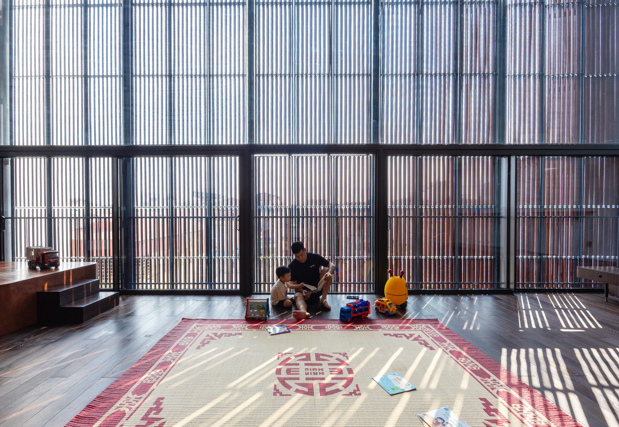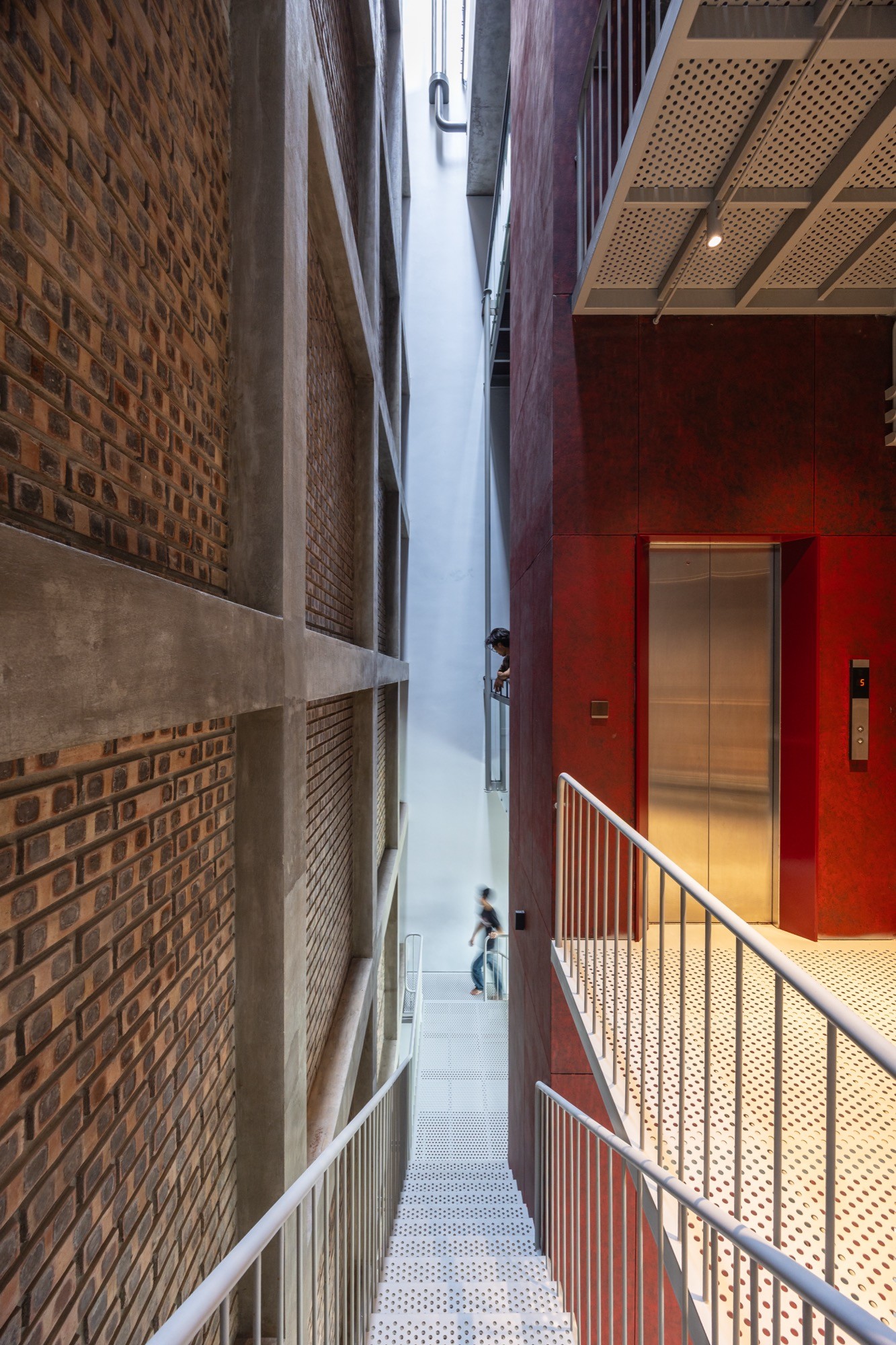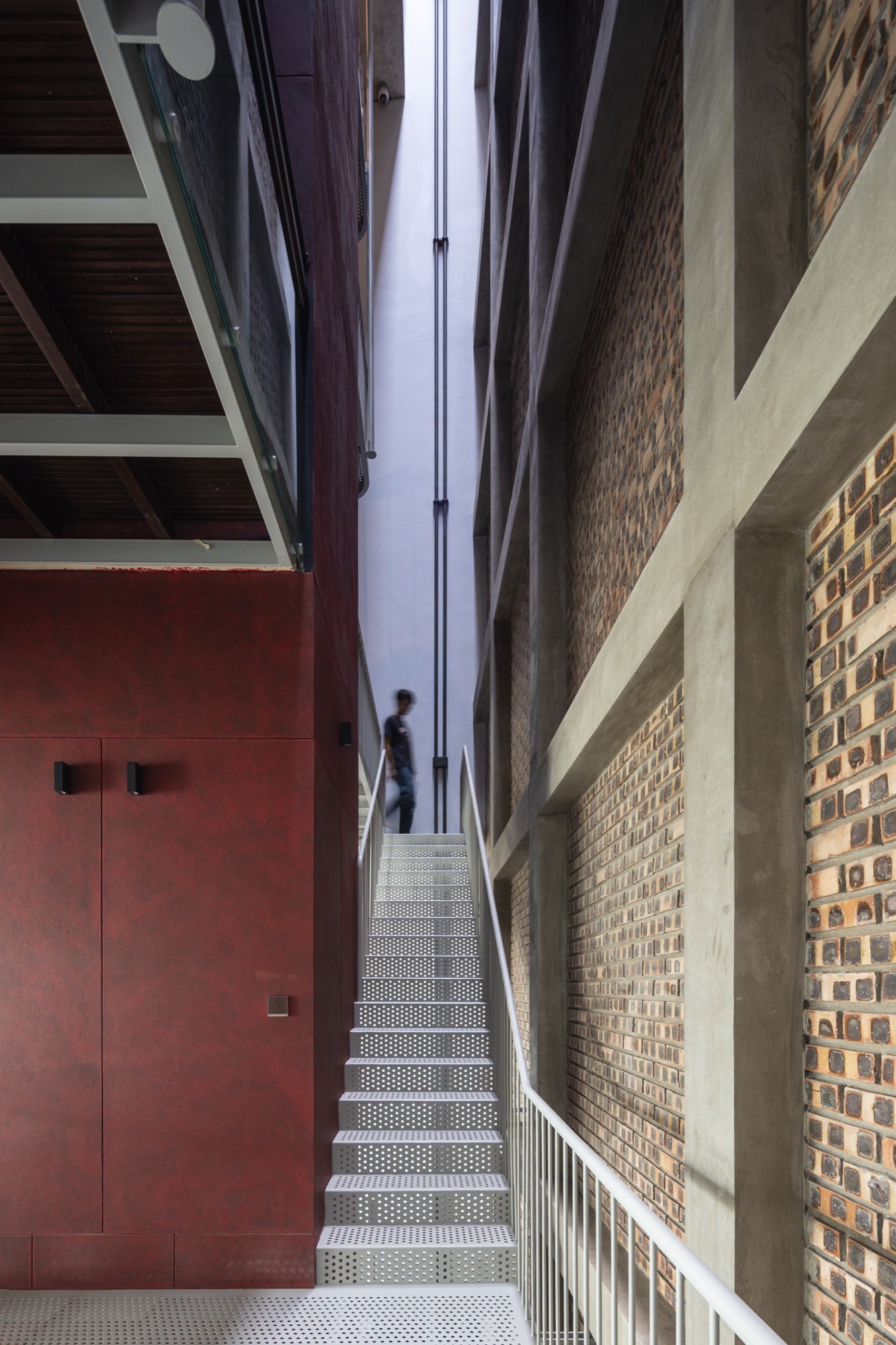 Cấu trúc nhà được phát triển theo chiều đứng, gồm bảy tầng và tầng mái, với các lớp không gian xen kẽ: sân vườn, hiên, khoảng trống và giếng trời. Tổ chức đa lớp này giúp thông gió tự nhiên và đưa ánh sáng vào sâu bên trong, đồng thời kết nối các tầng theo trục đứng. Lõi thang phía sau đóng vai trò trung tâm, hoạt động như “lá phổi” của ngôi nhà, dẫn gió và ánh sáng đến từng tầng, giảm sự phụ thuộc vào hệ thống cơ học.