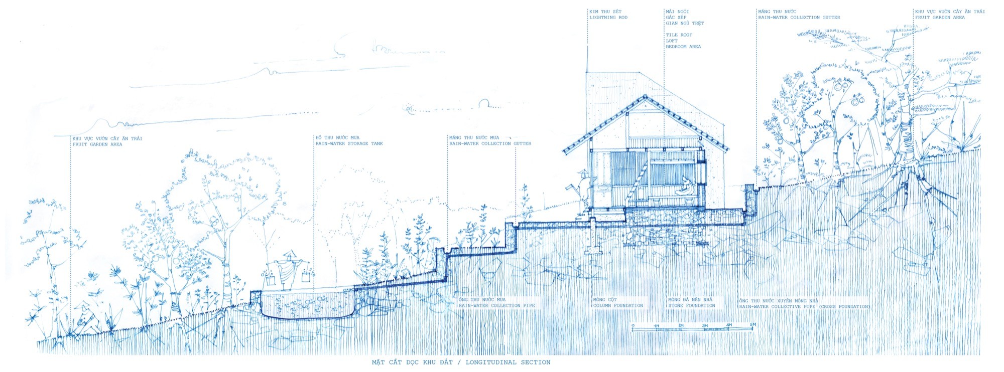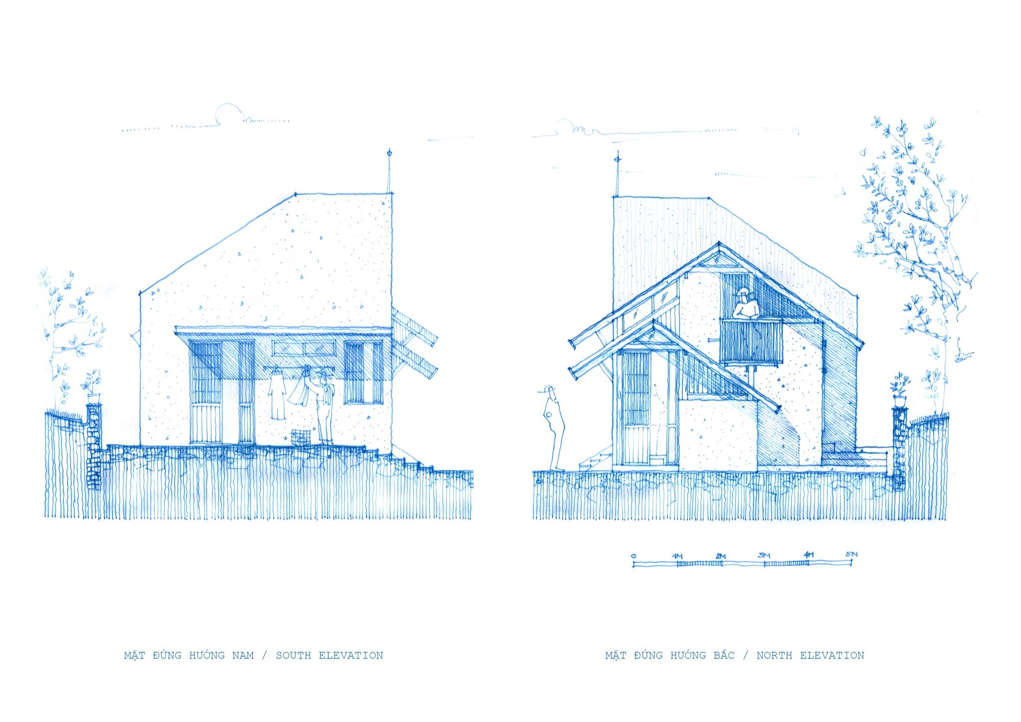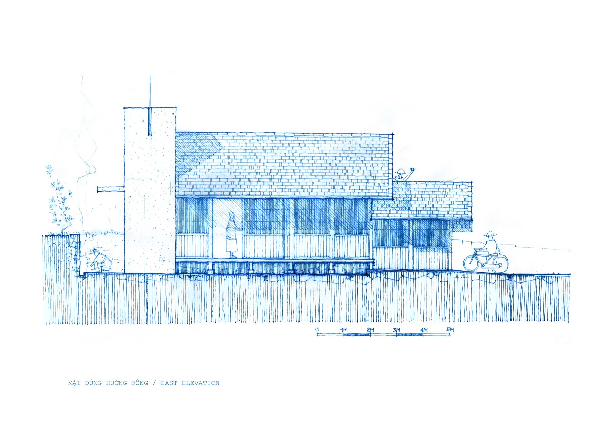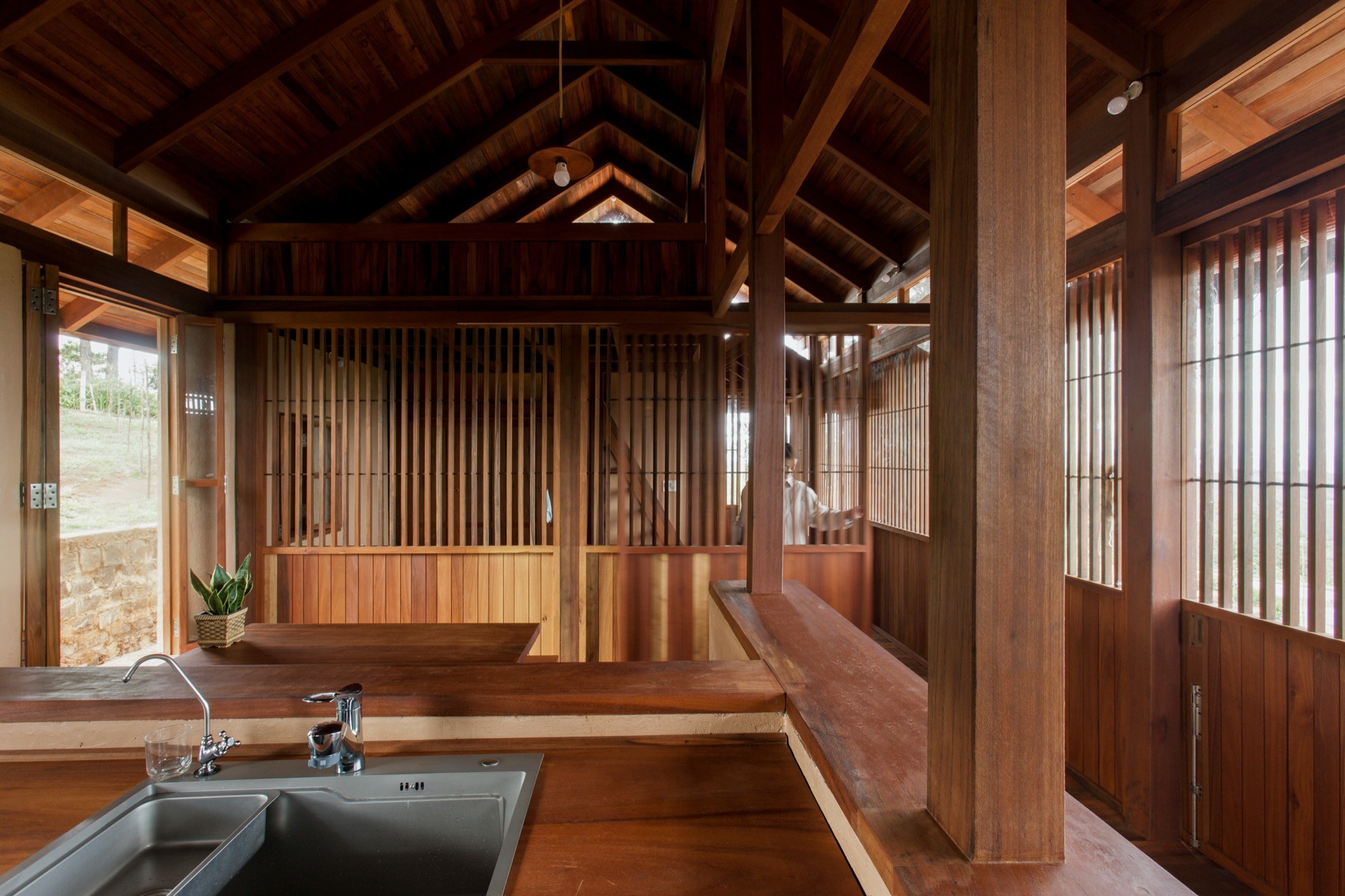 Hình khối được tổ chức từ nhu cầu tối giản và khả năng thi công trong điều kiện hạn chế. Một khối nhà nhỏ với mái dốc quen thuộc được lựa chọn như giải pháp hợp lý trước khí hậu mưa nhiều và địa hình dốc. Ngôn ngữ vật liệu giữ ở mức cơ bản, với gỗ, đất và ngói, không nhằm tạo hiệu ứng thị giác mà hướng đến sự bền vững và cảm giác gần gũi. Công trình vì thế hiện diện như một phần tiếp nối của bối cảnh, hơn là một đối tượng tách rời. Không gian bên trong phát triển theo phương ngang, tạo nên sự liên tục nhưng có kiểm soát. Các lớp lam gỗ đóng vai trò trung gian, vừa điều tiết ánh sáng vừa tạo độ sâu thị giác.