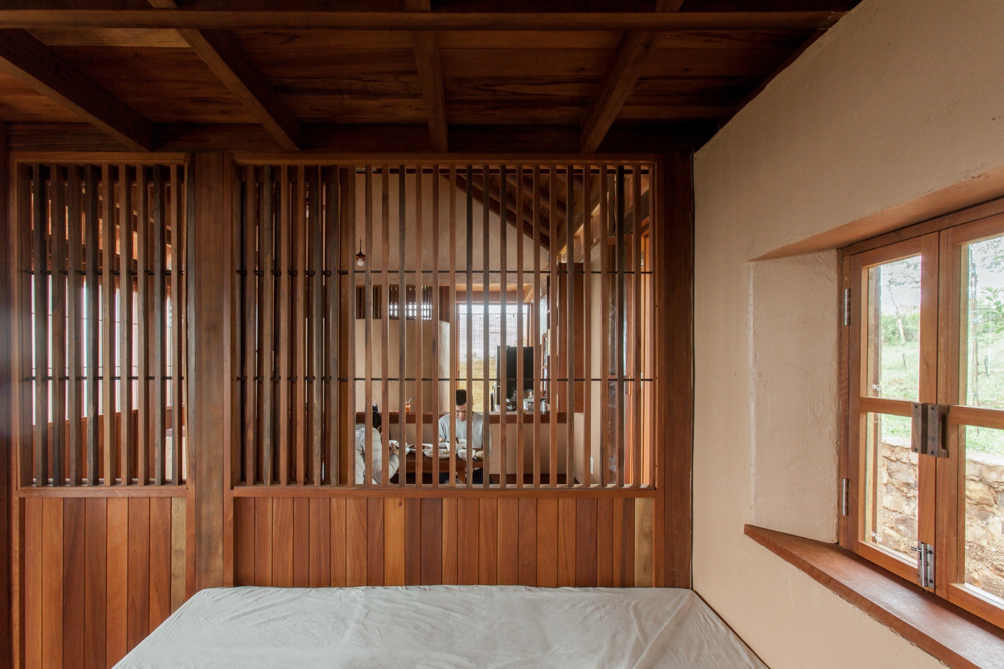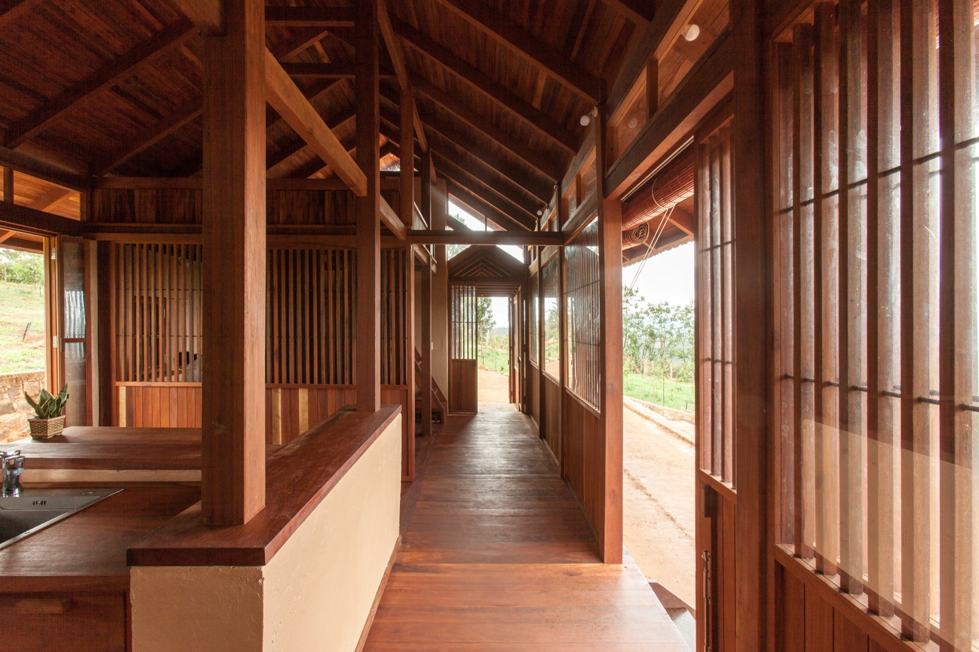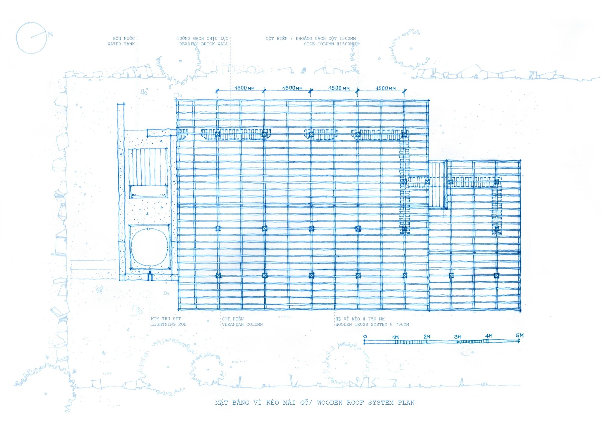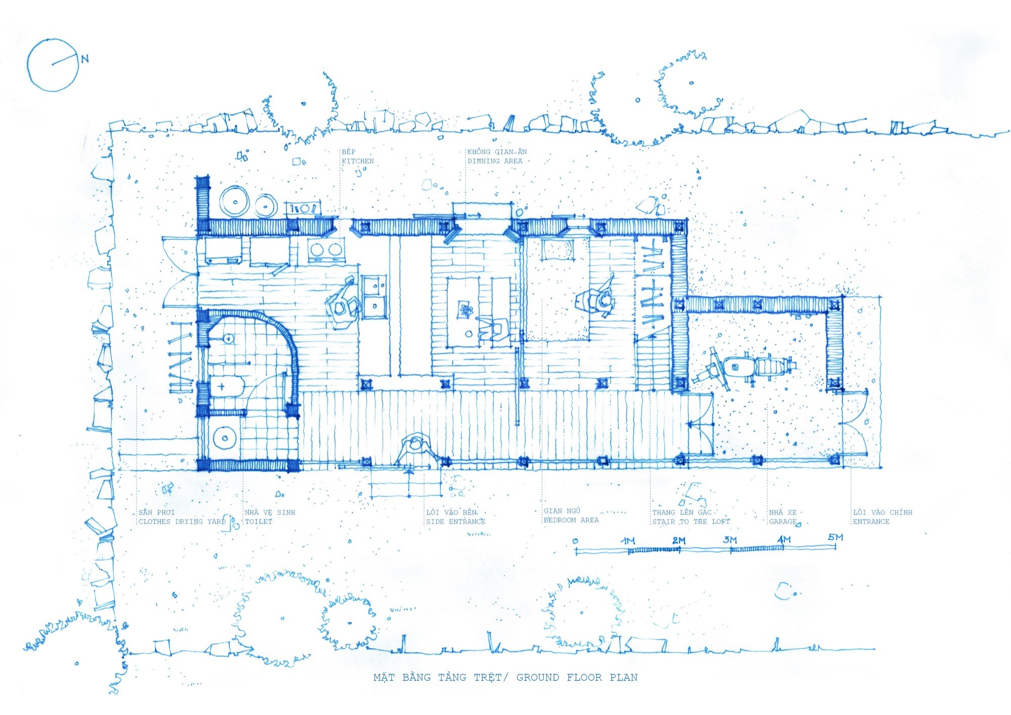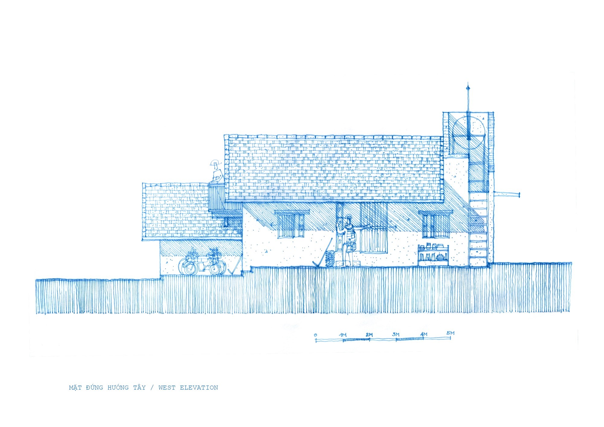 Hình khối được tổ chức từ nhu cầu tối giản và khả năng thi công trong điều kiện hạn chế. Một khối nhà nhỏ với mái dốc quen thuộc được lựa chọn như giải pháp hợp lý trước khí hậu mưa nhiều và địa hình dốc. Ngôn ngữ vật liệu giữ ở mức cơ bản, với gỗ, đất và ngói, không nhằm tạo hiệu ứng thị giác mà hướng đến sự bền vững và cảm giác gần gũi. Công trình vì thế hiện diện như một phần tiếp nối của bối cảnh, hơn là một đối tượng tách rời. Không gian bên trong phát triển theo phương ngang, tạo nên sự liên tục nhưng có kiểm soát. Các lớp lam gỗ đóng vai trò trung gian, vừa điều tiết ánh sáng vừa tạo độ sâu thị giác.