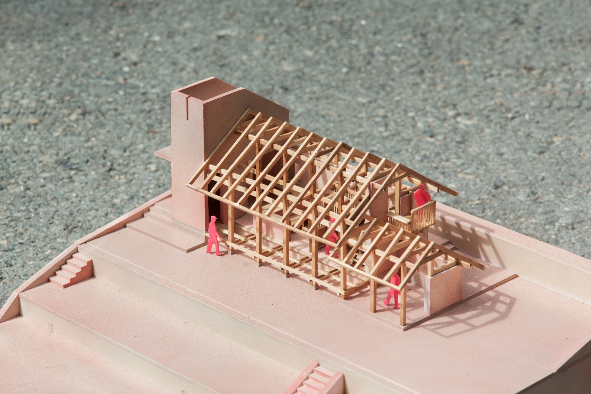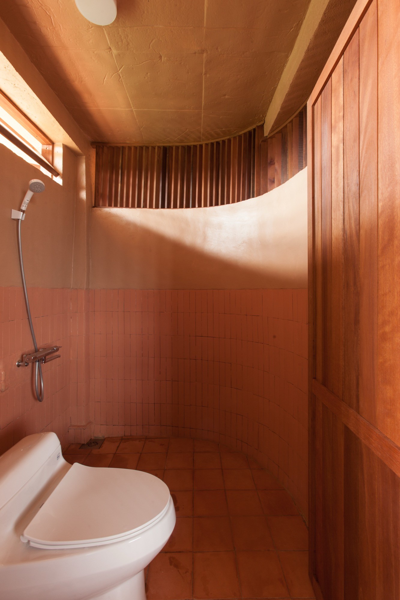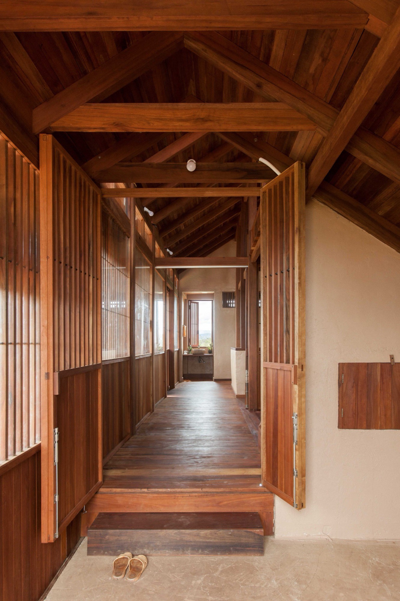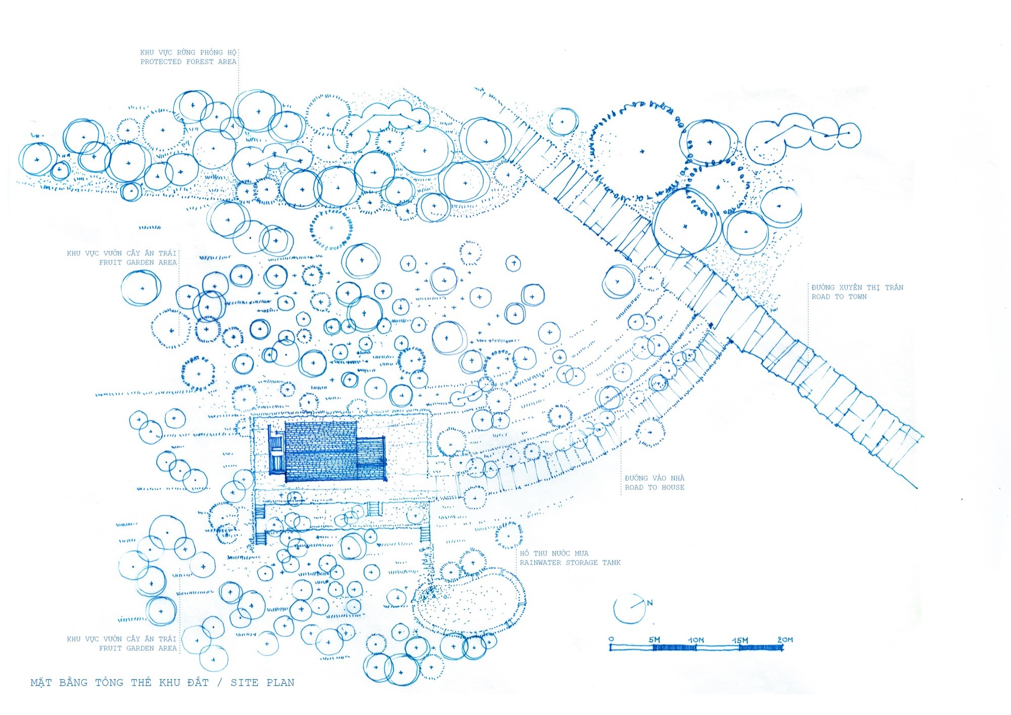 Hình khối được tổ chức từ nhu cầu tối giản và khả năng thi công trong điều kiện hạn chế. Một khối nhà nhỏ với mái dốc quen thuộc được lựa chọn như giải pháp hợp lý trước khí hậu mưa nhiều và địa hình dốc. Ngôn ngữ vật liệu giữ ở mức cơ bản, với gỗ, đất và ngói, không nhằm tạo hiệu ứng thị giác mà hướng đến sự bền vững và cảm giác gần gũi. Công trình vì thế hiện diện như một phần tiếp nối của bối cảnh, hơn là một đối tượng tách rời. Không gian bên trong phát triển theo phương ngang, tạo nên sự liên tục nhưng có kiểm soát. Các lớp lam gỗ đóng vai trò trung gian, vừa điều tiết ánh sáng vừa tạo độ sâu thị giác.