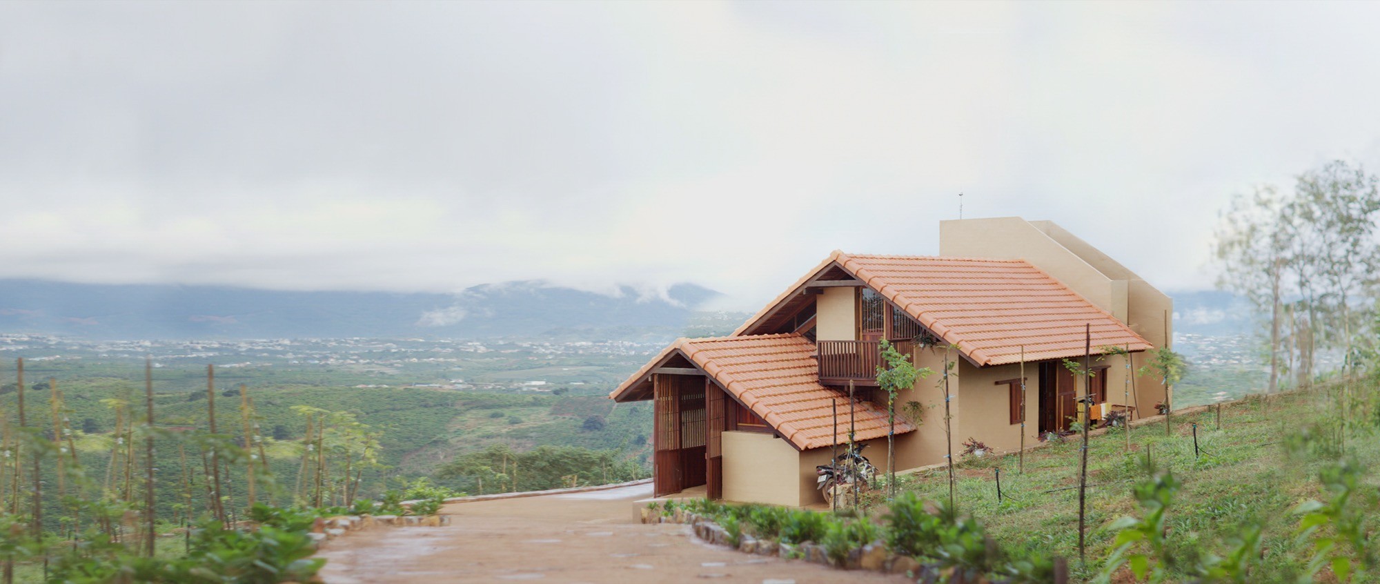 Tọa lạc trên đỉnh một triền đồi tại Di Linh, ngôi nhà được tiếp cận qua một con đường đất vẫn còn lầy trơn sau mỗi cơn mưa. Điều kiện địa hình và khí hậu này không chỉ là bối cảnh, mà trở thành tiền đề trực tiếp cho cách tiếp cận thiết kế. Thay vì áp đặt một hình thái kiến trúc nổi bật, công trình lựa chọn chiến lược tiết chế, gọn nhẹ và thích ứng, đặt mình thấp xuống trong cảnh quan rộng mở của đồi chè và rừng thông.