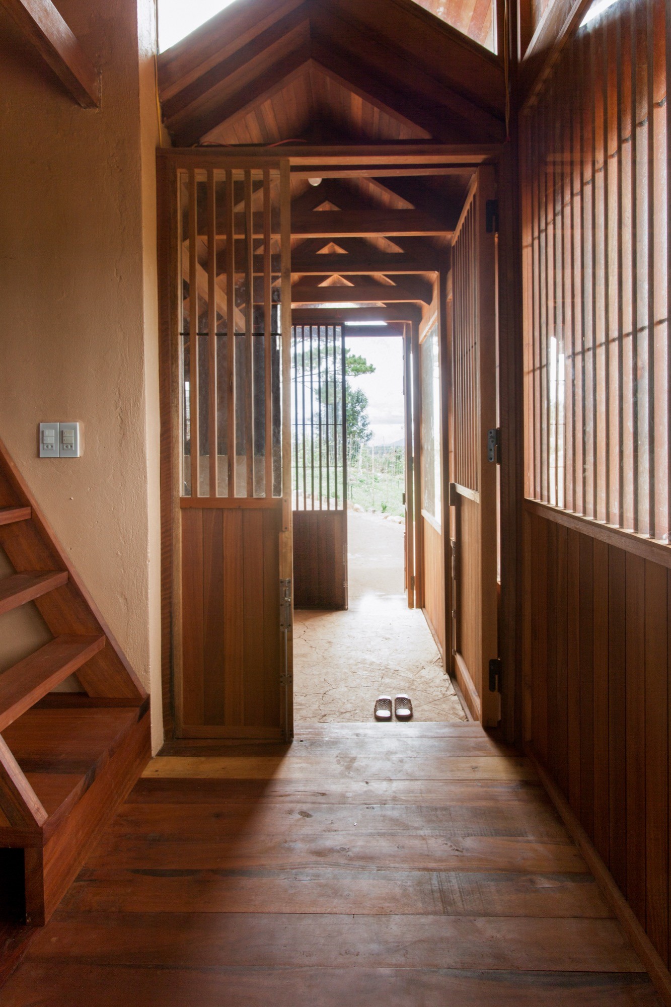 Ánh sáng tự nhiên được lọc qua các lớp này, phản chiếu lên bề mặt vật liệu thô, góp phần định hình một bầu không khí tĩnh và chậm, phù hợp với nhịp sống nghỉ dưỡng. Chiến lược tổ chức không gian thể hiện rõ qua sự phân định giữa mở và đóng. Mặt chính của công trình hướng về thung lũng, mở rộng tầm nhìn và đón gió. Ngược lại, phía tiếp cận từ đường được xử lý kín đáo hơn, nhằm giảm tác động của mưa, gió và bùn đất. Sự định hướng này cho phép ngôi nhà vừa khai thác tối đa giá trị của cảnh quan, vừa đảm bảo điều kiện vi khí hậu ổn định cho sinh hoạt.
